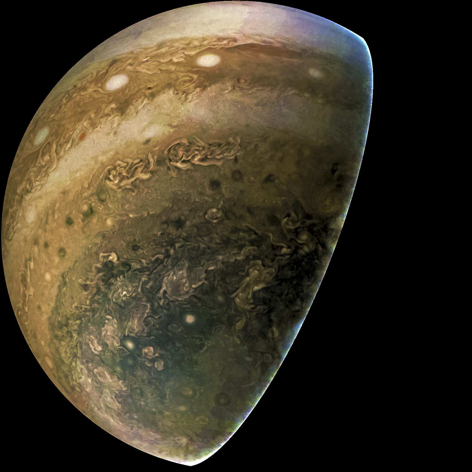Junocam pixels are 12 bits deep from the camera but are converted to 8 bits inside the instrument using a lossless "companding" table, a process similar to gamma correction, to reduce their size. All Junocam products on the missionjuno website are in this 8-bit form as received on Earth. Scientific users interested in radiometric analysis should use the "RDR" data products archived with the Planetary Data System, which have been converted back to a linear 12-bit scale.