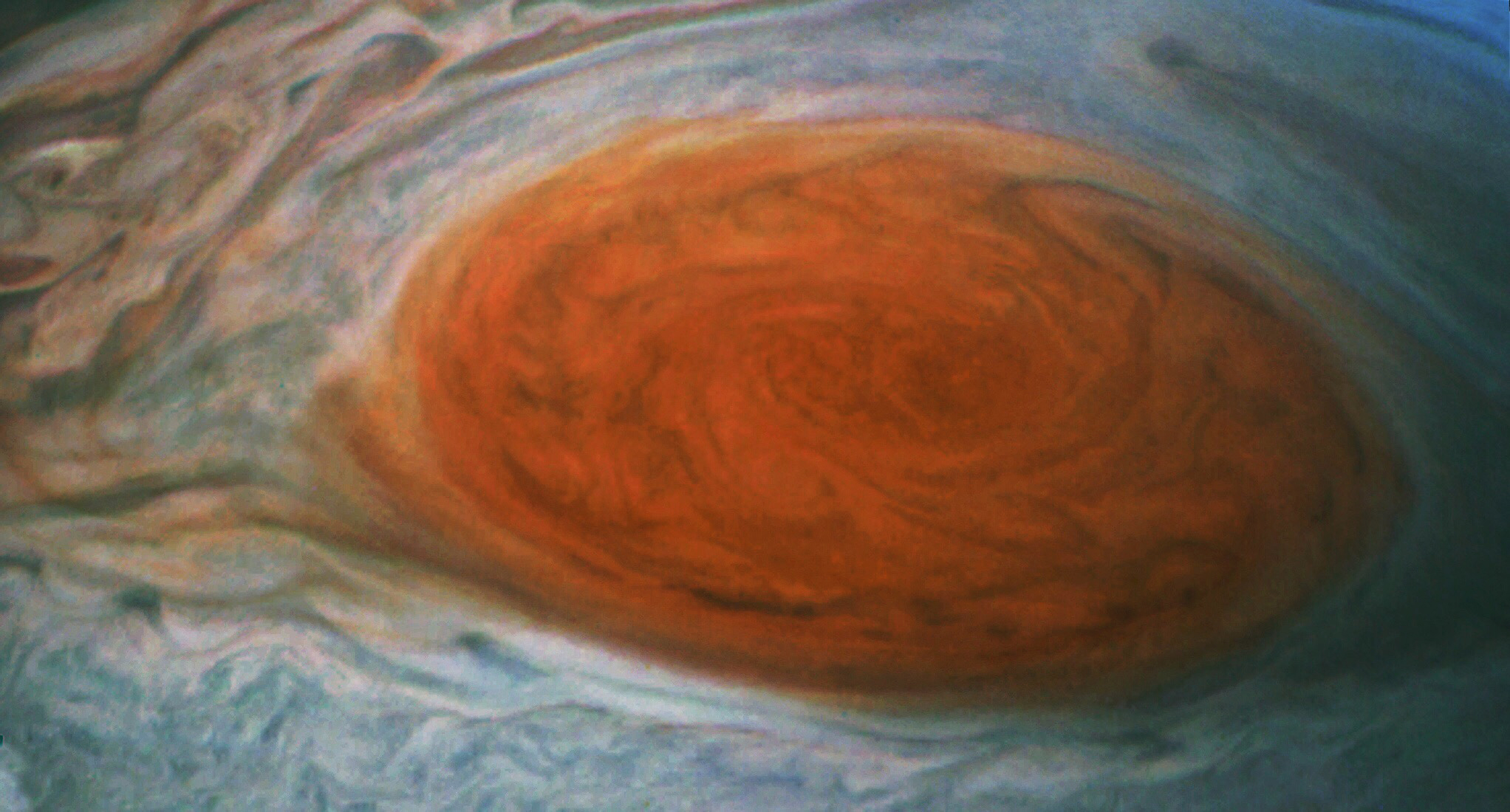 This is a processed close-up image of Jupiter's Great Red Spot as captured by JUNO spacecraft which passed about 5,600 miles over the 10,000-mile-wide storm on July 7, 2017.