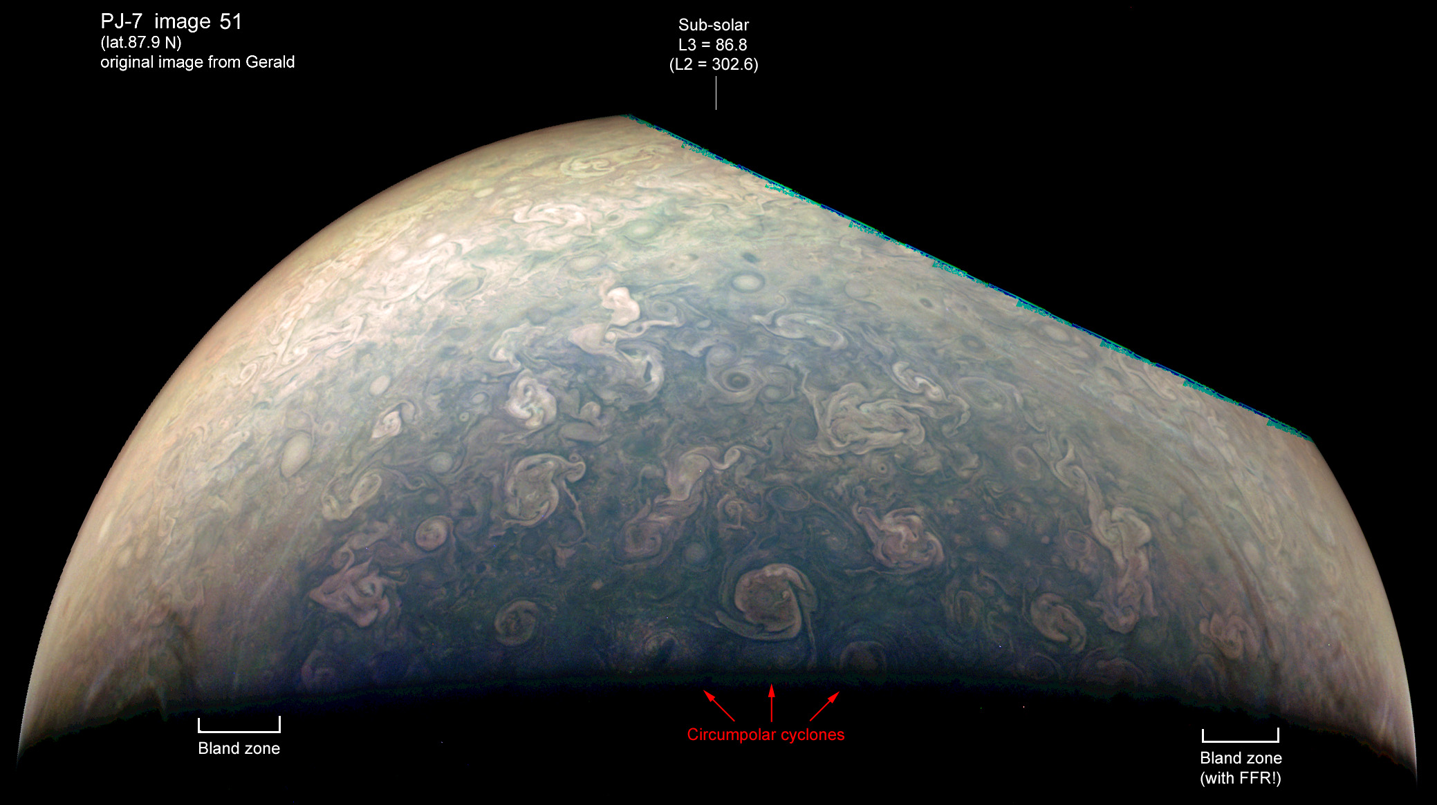 The view over the north pole at PJ7 (image 51 as processed by Gerald), with some of the now-familiar features labelled.