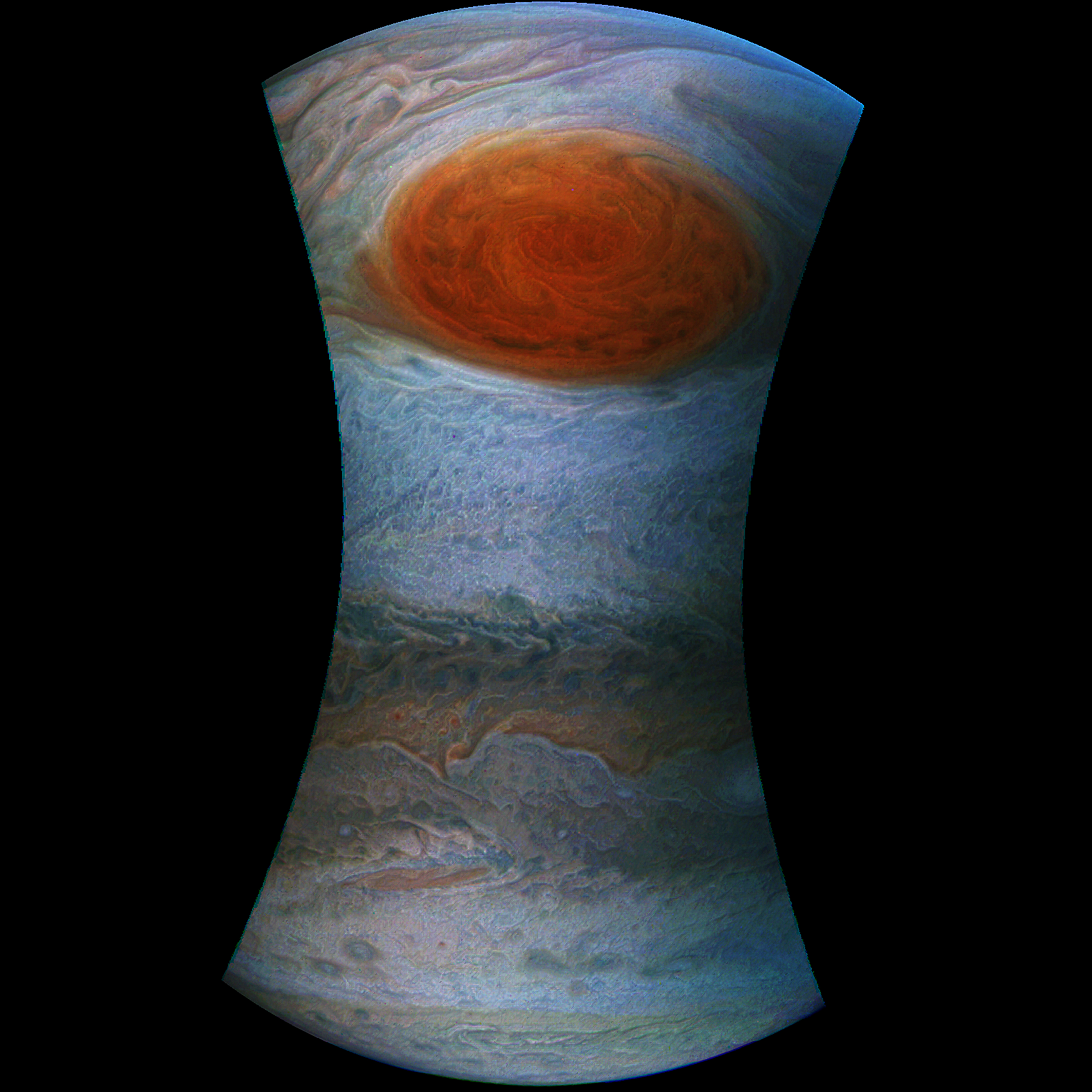 the image shows a overlay of two images. One with the original image information made by Juno (with some post processing). An other one with some 3D information based on the color distribution within the original image. The idea is to imaging how the structure within the dynamic clouds could look like from a special point of view. Maybe the red spot is located a bit deeper than the rest of the clouds because of the fast rotation? I hope you like it! :)