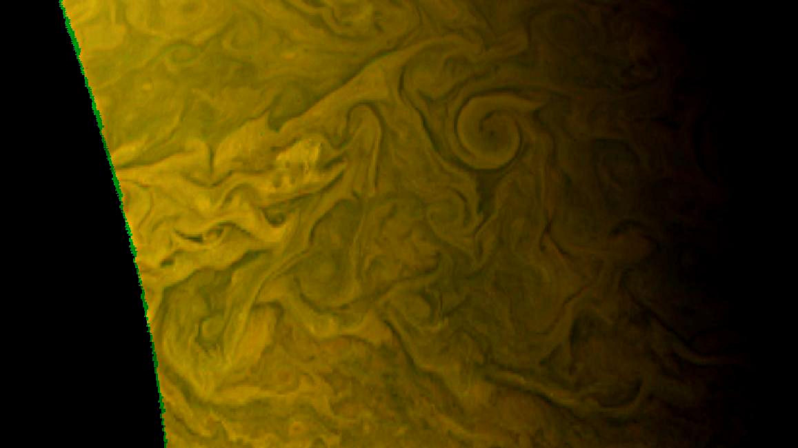 Junocam pixels are 12 bits deep from the camera but are converted to 8 bits inside the instrument using a lossless "companding" table, a process similar to gamma correction, to reduce their size. All Junocam products on the missionjuno website are in this 8-bit form as received on Earth. Scientific users interested in radiometric analysis should use the "RDR" data products archived with the Planetary Data System, which have been converted back to a linear 12-bit scale.