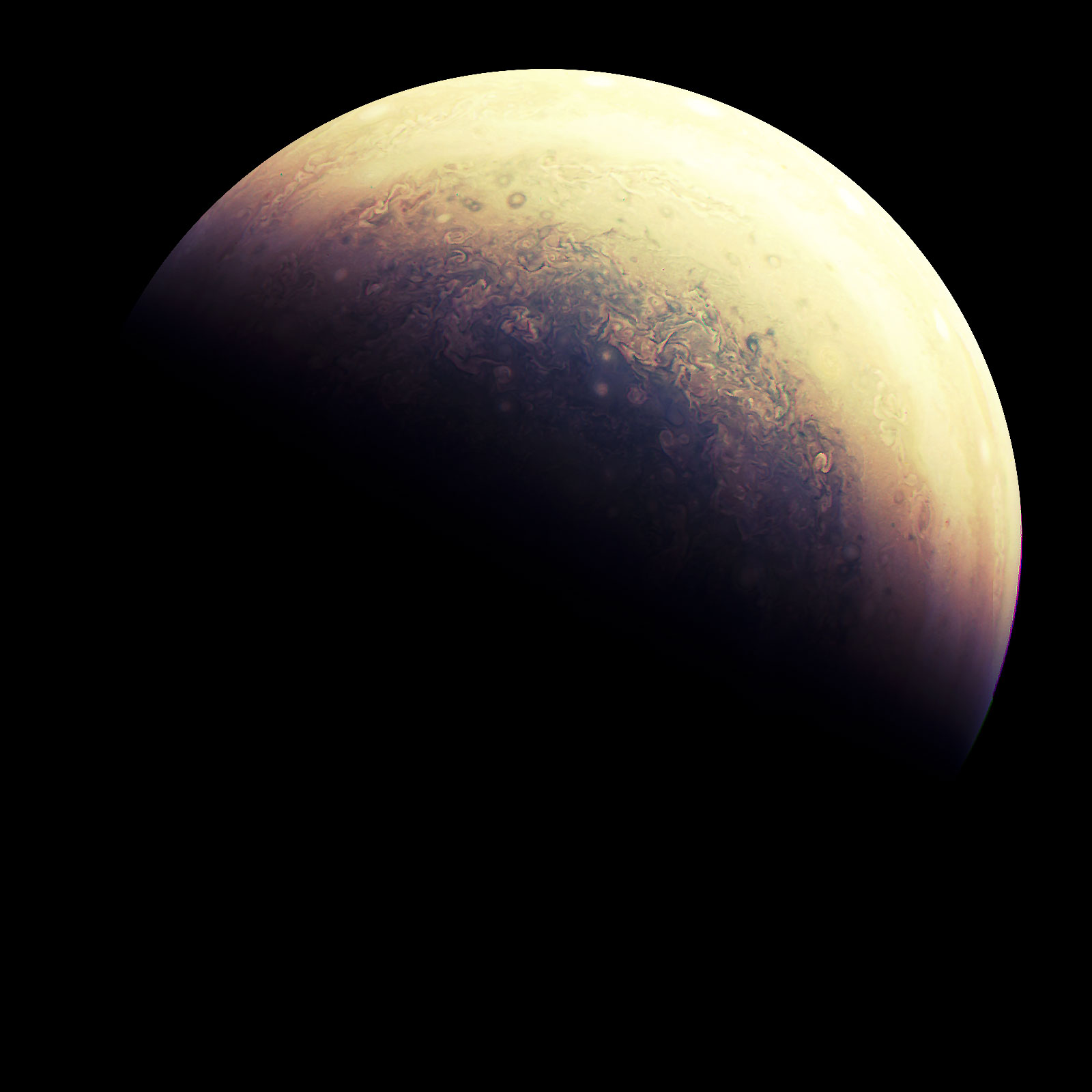 Junocam pixels are 12 bits deep from the camera but are converted to 8 bits inside the instrument using a lossless "companding" table, a process similar to gamma correction, to reduce their size. All Junocam products on the missionjuno website are in this 8-bit form as received on Earth. Scientific users interested in radiometric analysis should use the "RDR" data products archived with the Planetary Data System, which have been converted back to a linear 12-bit scale.
