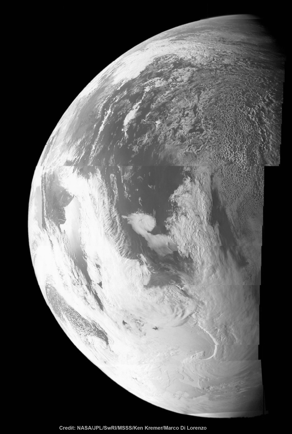 This composite shows more than half of Earth’s disk over the coast of Argentina and the South Atlantic Ocean as the Juno probe slingshotted by on Oct. 9, 2013 for a gravity assisted acceleration to Jupiter. The mosaic was assembled from raw images taken by the Junocam imager.