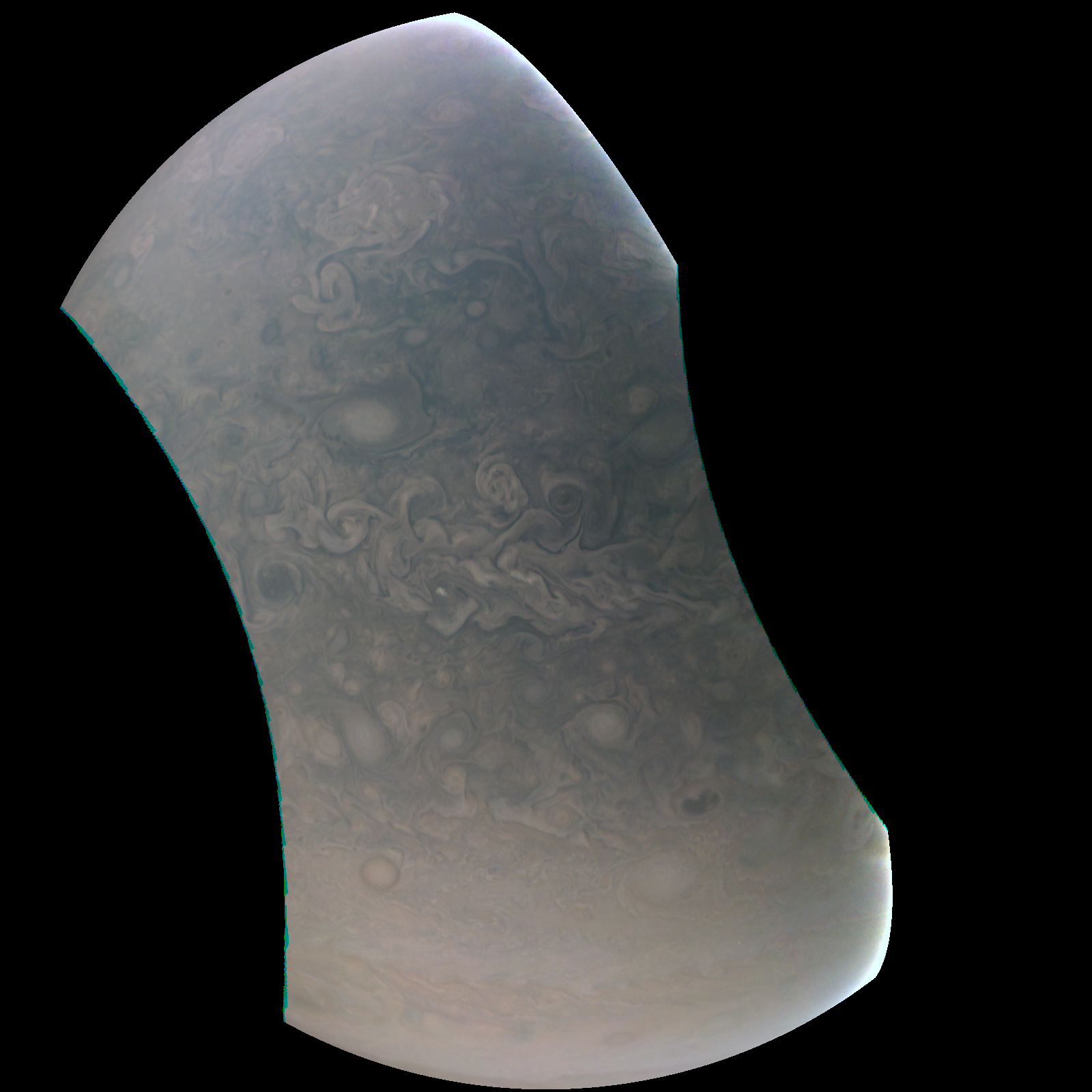 Junocam pixels are 12 bits deep from the camera but are converted to 8 bits inside the instrument using a lossless "companding" table, a process similar to gamma correction, to reduce their size. All Junocam products on the missionjuno website are in this 8-bit form as received on Earth. Scientific users interested in radiometric analysis should use the "RDR" data products archived with the Planetary Data System, which have been converted back to a linear 12-bit scale.