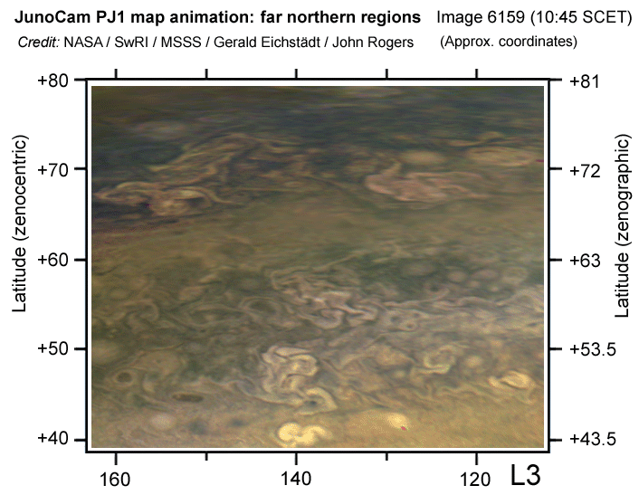 This animation covers latitudes 43-80ºN, over an interval of 73 minutes, and clearly shows the cyclonic (clockwise) circulation of the chaotic ‘folded filamentary regions’ (FFRs). It also shows prograde jets (blowing to the right) at ~55ºN and 67ºN (zenographic latitudes), which are the N5 and N6 jets known from previous spacecraft. This is the first such short-term animation ever produced of these high latitudes.