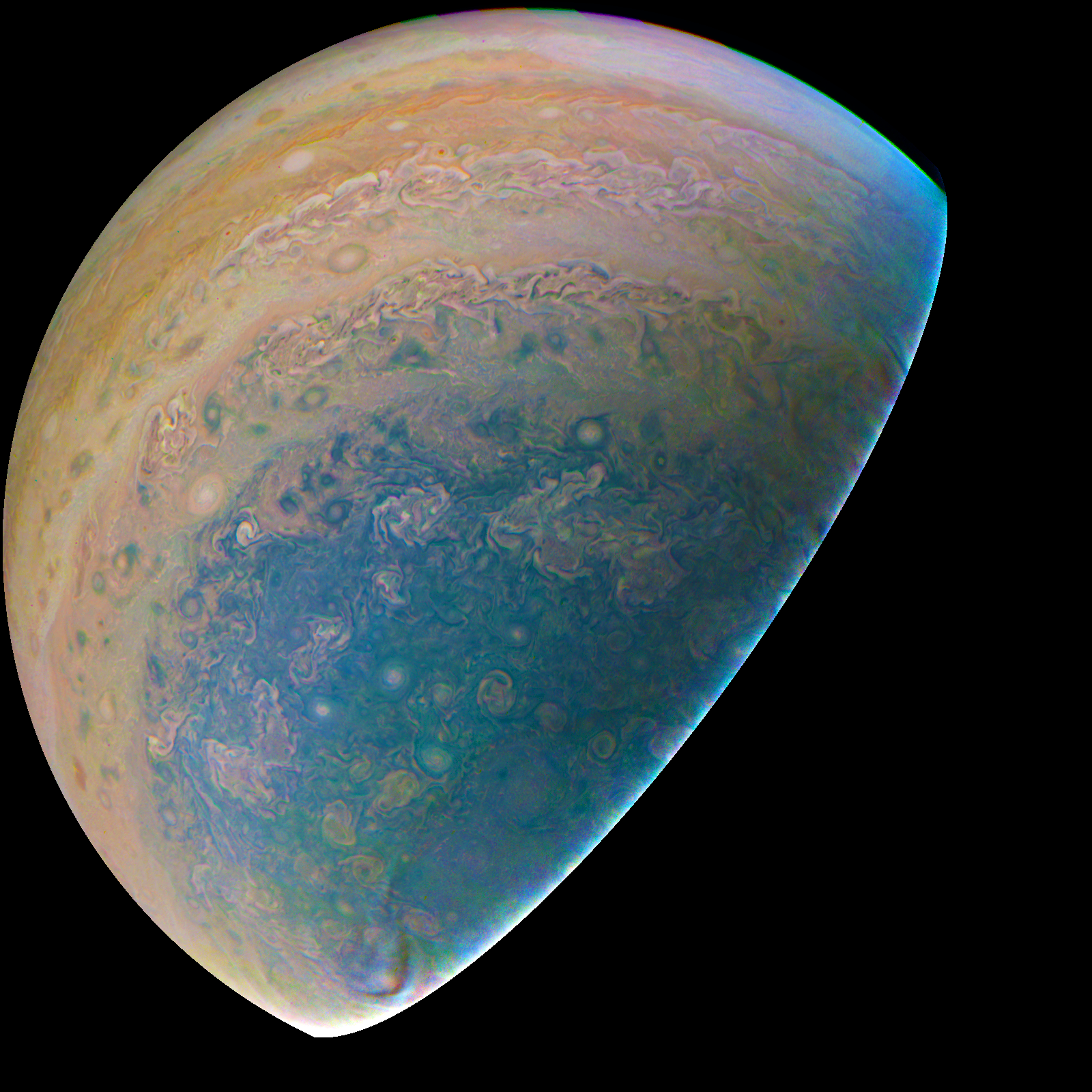 Here we can apreciate the vivid colors of the different gases in Jupiter's atmosfere. The contrast between the orange that surround almost all the planet and the blue that reigns in the south pole of the gigant. It reminds you of a painting of a beach made a few centuries ago.