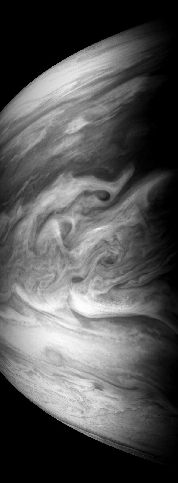 Junocam pixels are 12 bits deep from the camera but are converted to 8 bits inside the instrument using a lossless "companding" table, a process similar to gamma correction, to reduce their size. All Junocam products on the missionjuno website are in this 8-bit form as received on Earth. Scientific users interested in radiometric analysis should use the "RDR" data products archived with the Planetary Data System, which have been converted back to a linear 12-bit scale.