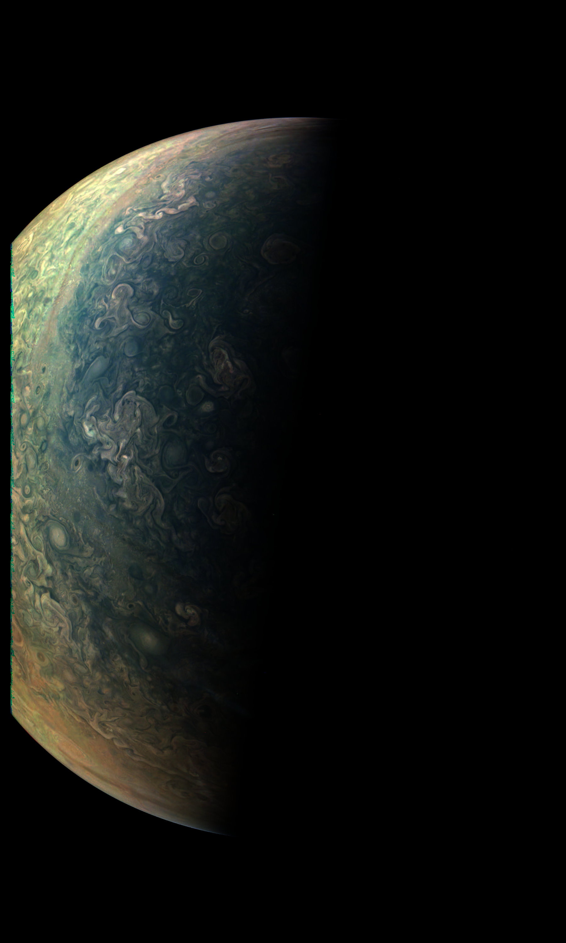 Junocam pixels are 12 bits deep from the camera but are converted to 8 bits inside the instrument using a lossless "companding" table, a process similar to gamma correction, to reduce their size. All Junocam products on the missionjuno website are in this 8-bit form as received on Earth. Scientific users interested in radiometric analysis should use the "RDR" data products archived with the Planetary Data System, which have been converted back to a linear 12-bit scale.