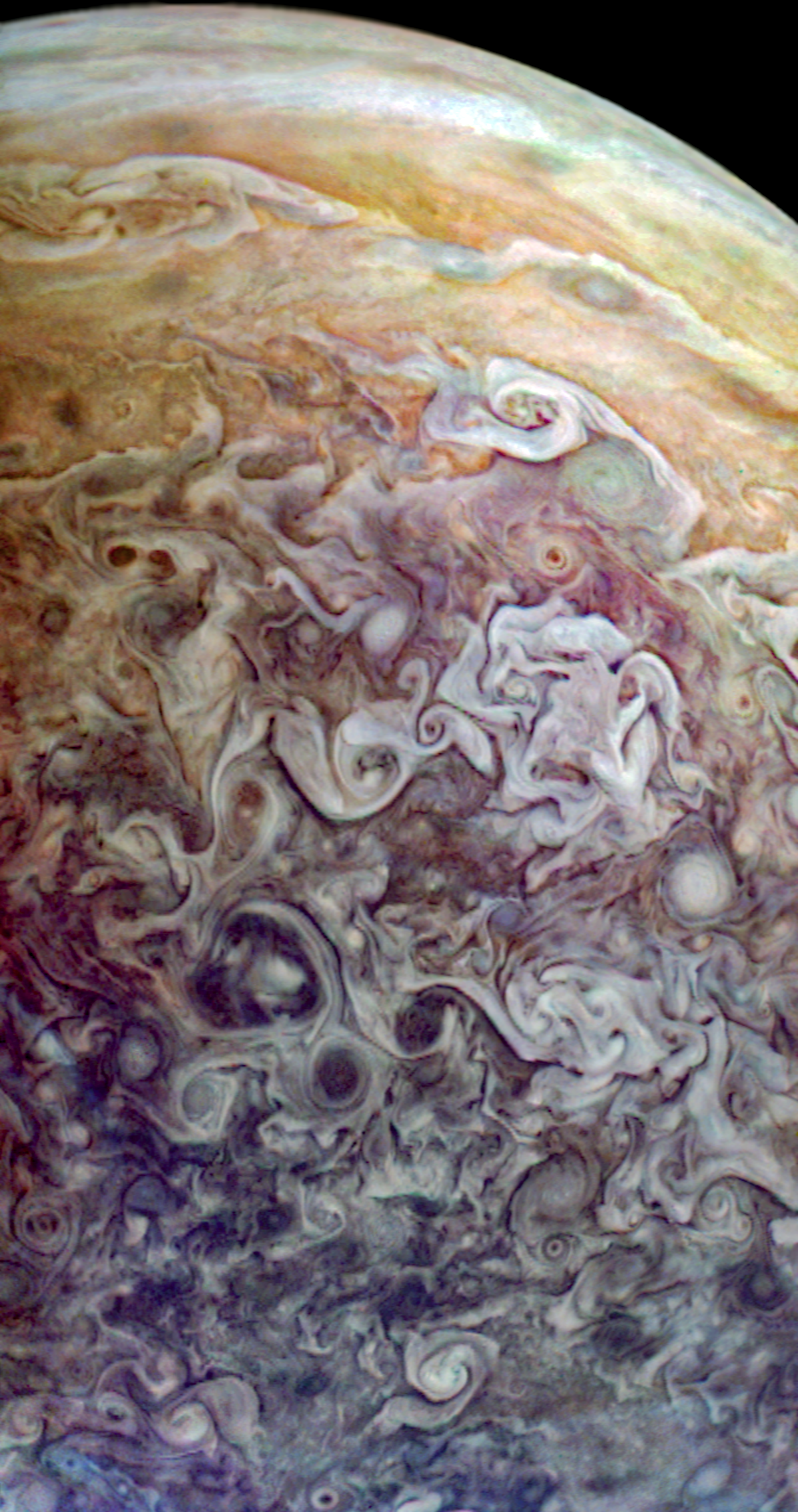 Enhanced colour showing variable swirl patterns in the northern region of Jupiter.