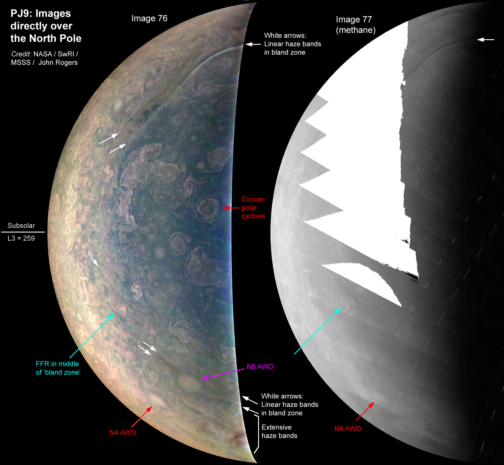 Here, the typical features of the north polar region are indicated on the colour and methane images over the north pole. This is from a report on the PJ9 images, posted on the BAA Jupiter Section web site at: https://britastro.org/node/11780