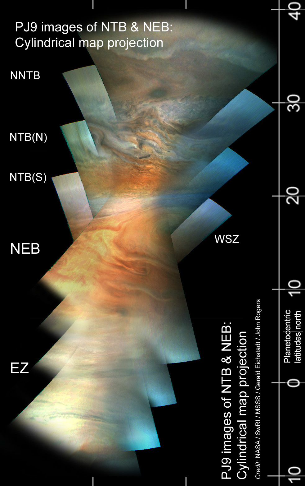 This is a map made from the PJ9 close-ups of the NTB and NEB (images 82-85), as projected by Gerald Eichstädt. All the images cover one half of 'White Spot Z', a huge, long-lived anticyclonic oval -- which looks light brown or orange at present. Light 'rifts' (appearing saturated yellow in this version) are draped around it. This is from a report on the PJ9 images, posted on the BAA Jupiter Section web site at: https://britastro.org/node/11780