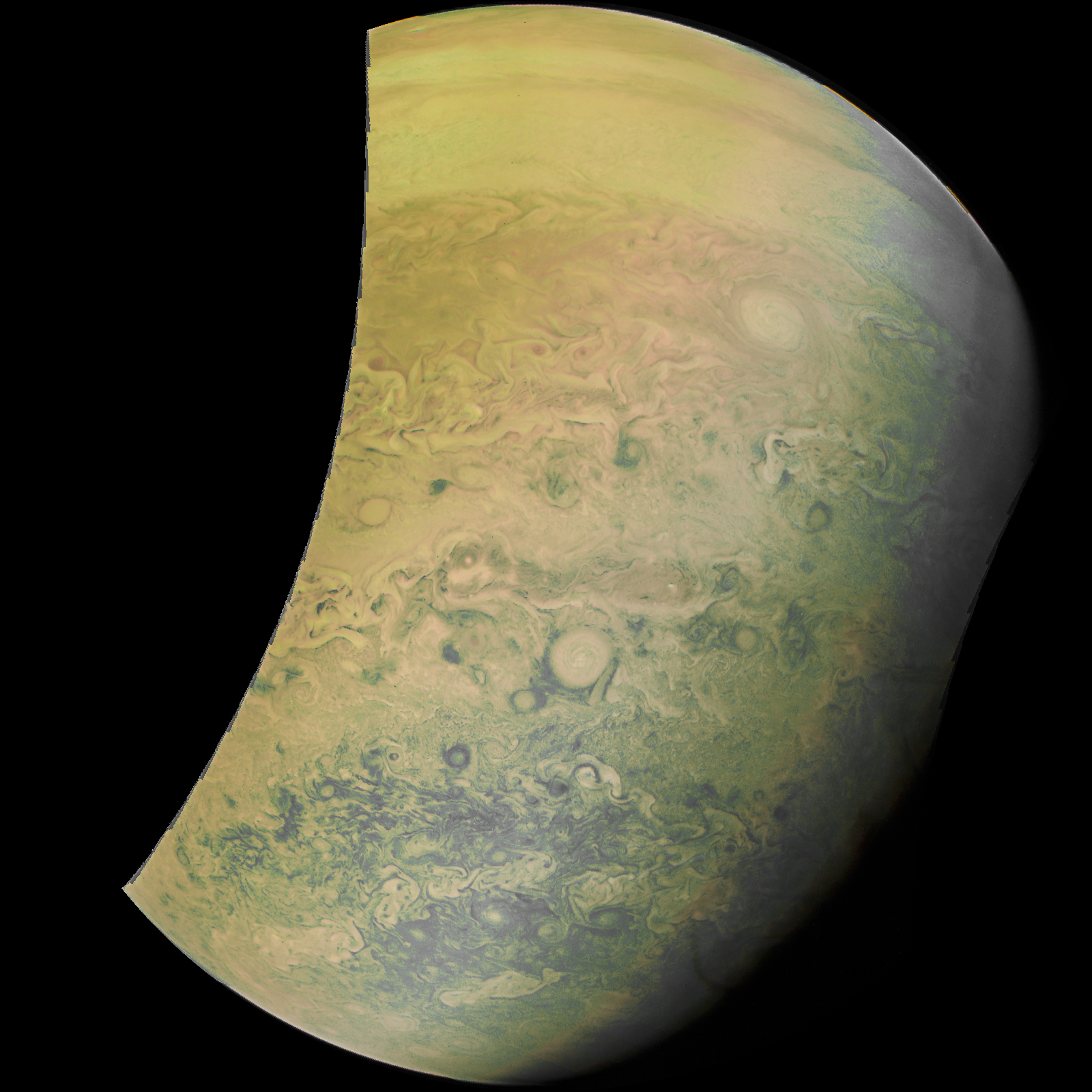 Junocam pixels are 12 bits deep from the camera but are converted to 8 bits inside the instrument using a lossless "companding" table, a process similar to gamma correction, to reduce their size. All Junocam products on the missionjuno website are in this 8-bit form as received on Earth. Scientific users interested in radiometric analysis should use the "RDR" data products archived with the Planetary Data System, which have been converted back to a linear 12-bit scale.
