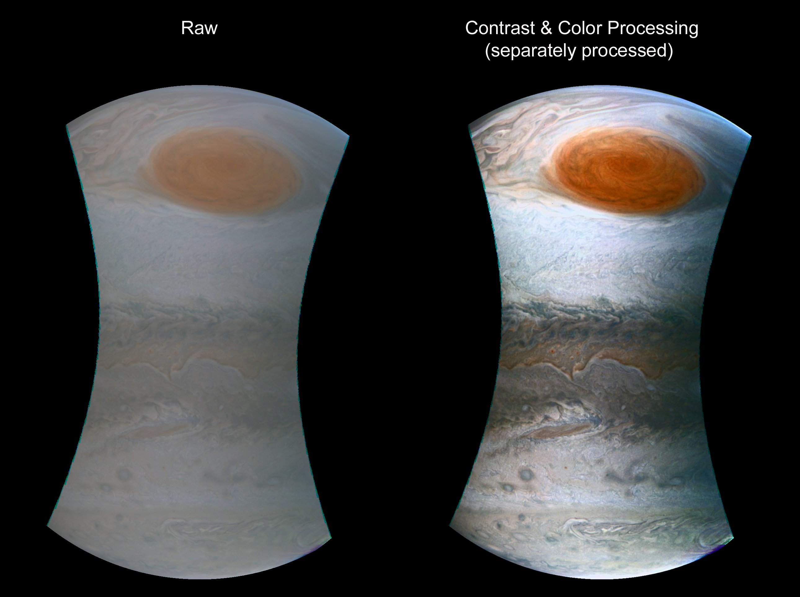 Junocam pixels are 12 bits deep from the camera but are converted to 8 bits inside the instrument using a lossless "companding" table, a process similar to gamma correction, to reduce their size. All Junocam products on the missionjuno website are in this 8-bit form as received on Earth. Scientific users interested in radiometric analysis should use the "RDR" data products archived with the Planetary Data System, which have been converted back to a linear 12-bit scale.