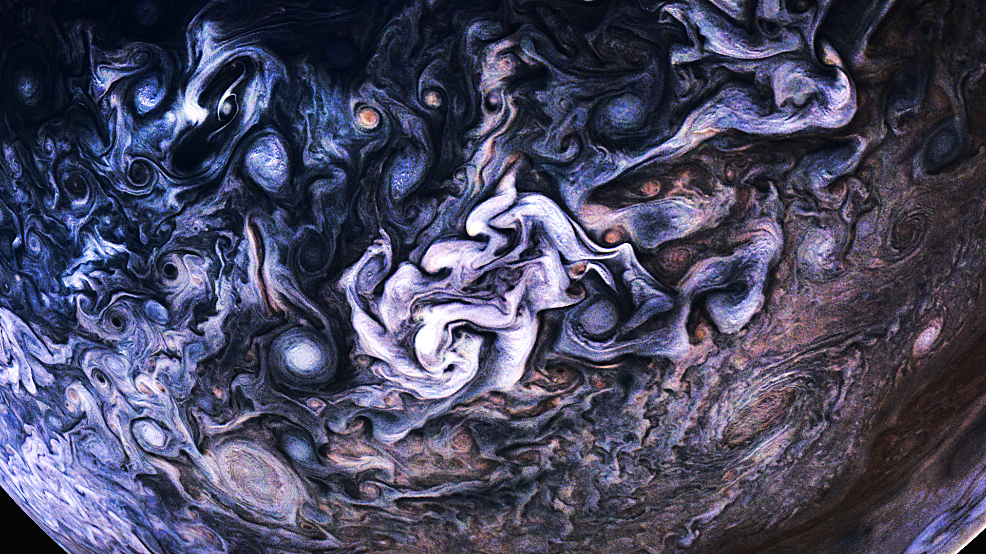 This image is a still of a Perijove-10 flyby movie. Colors are enhanced, white-balanced, saturation-stretched, further brightness stretched in an image-specific way, and sharpened.