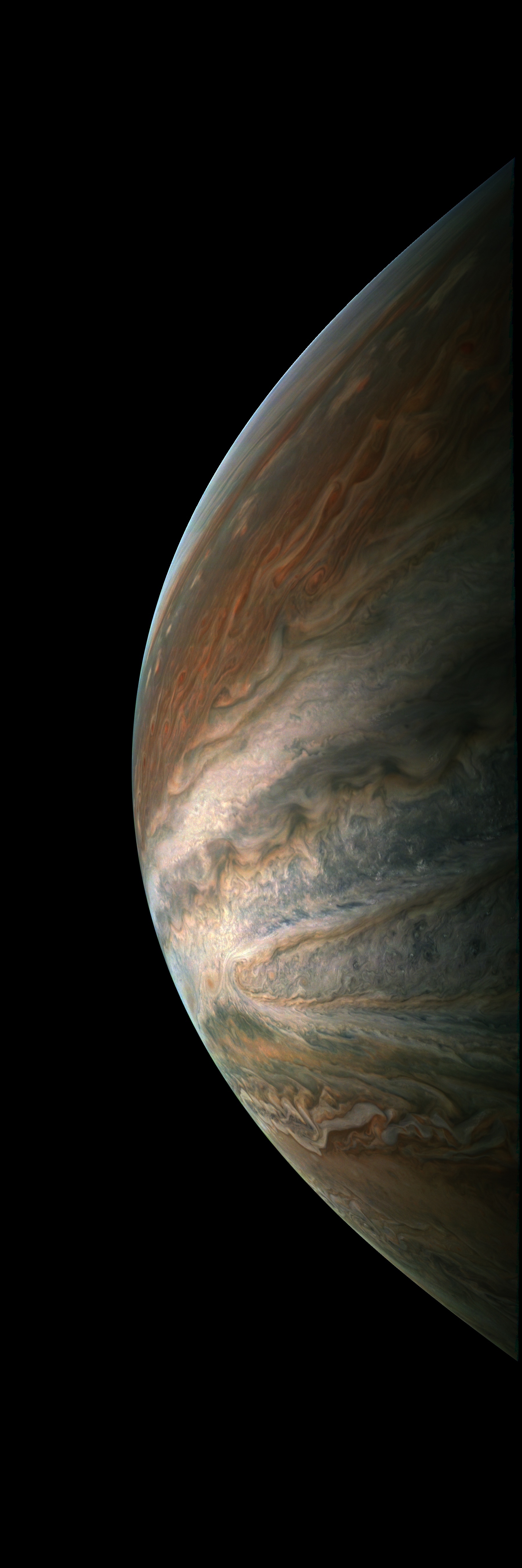 This image has been taken during Juno's Perijove-10 Jupiter flyby. It is rendered directly from the raw in one monolithitic step, except file format conversions.