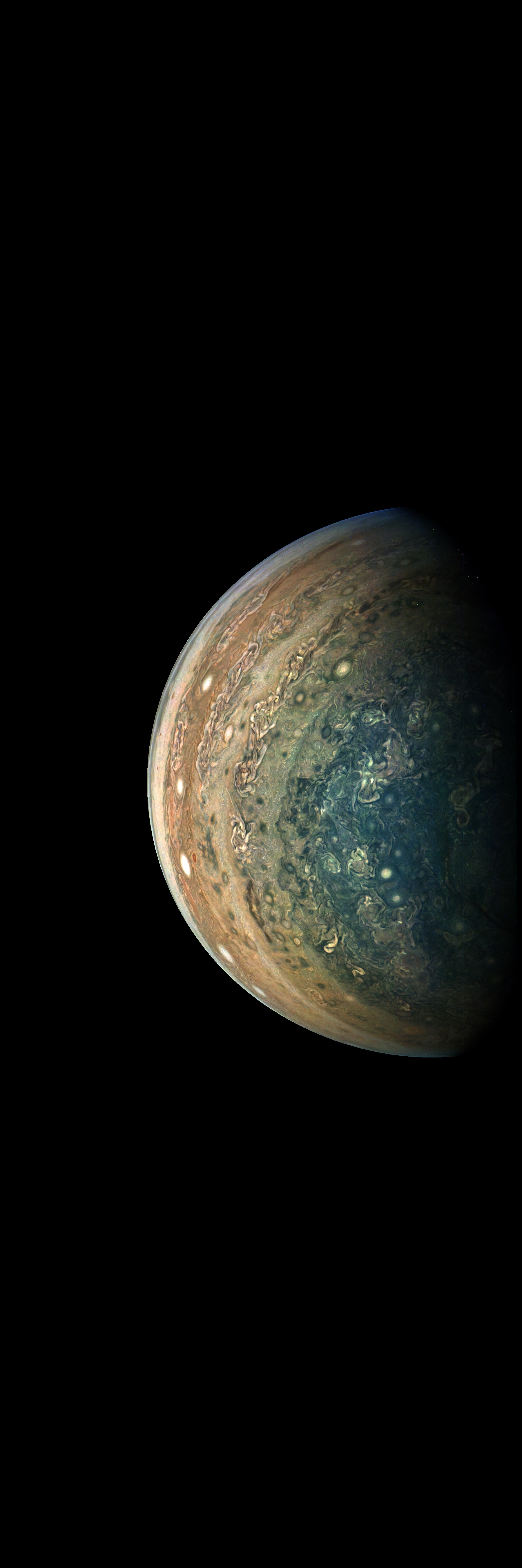 This image has been taken during Juno's Perijove-10 Jupiter flyby. It is rendered directly from the raw in one monolithitic step, except file format conversions.