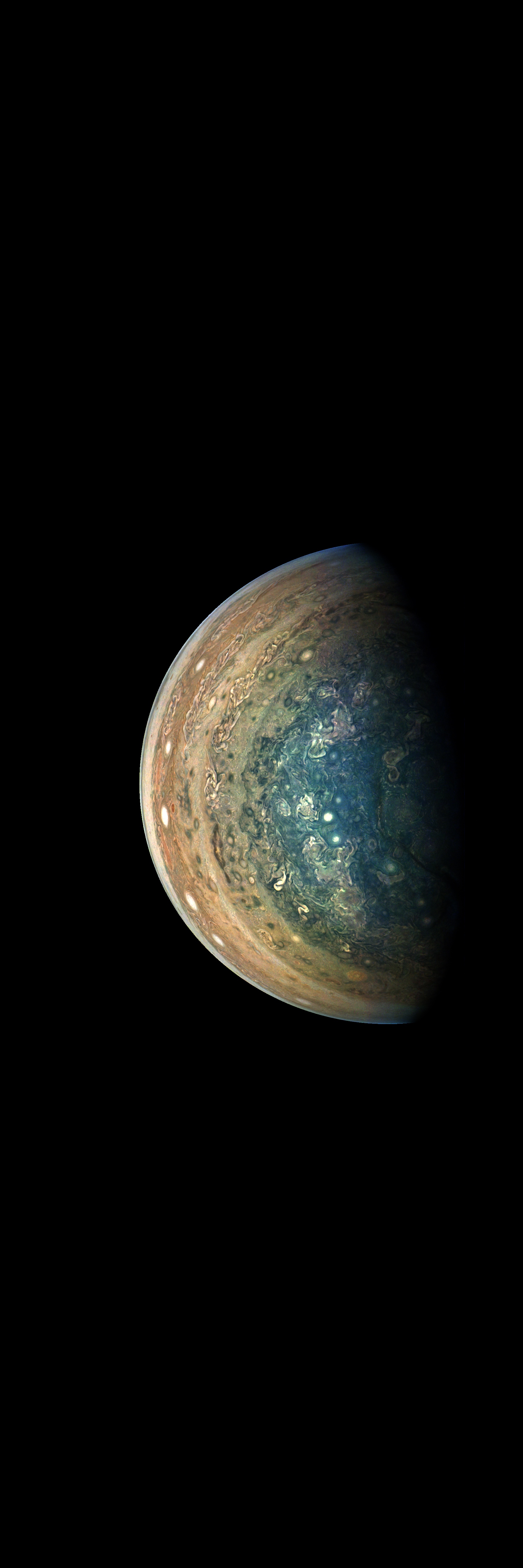 This image has been taken during Juno's Perijove-10 Jupiter flyby. It is rendered directly from the raw in one monolithitic step, except file format conversions.