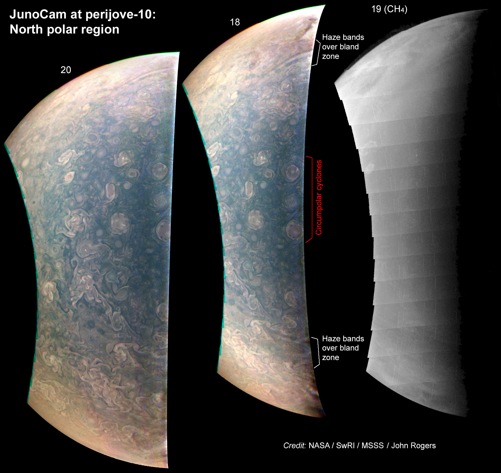 Here are annotated copies of the views over the North Pole at PJ10, showing the now-familiar features; the circumpolar cyclones (a line of 3 of them), the masses of chaotic cyclonic features, and the bundles of white and brown haze bands lying over the (now rather disturbed) bland zone. This is part of a report on the PJ10 images just posted at: