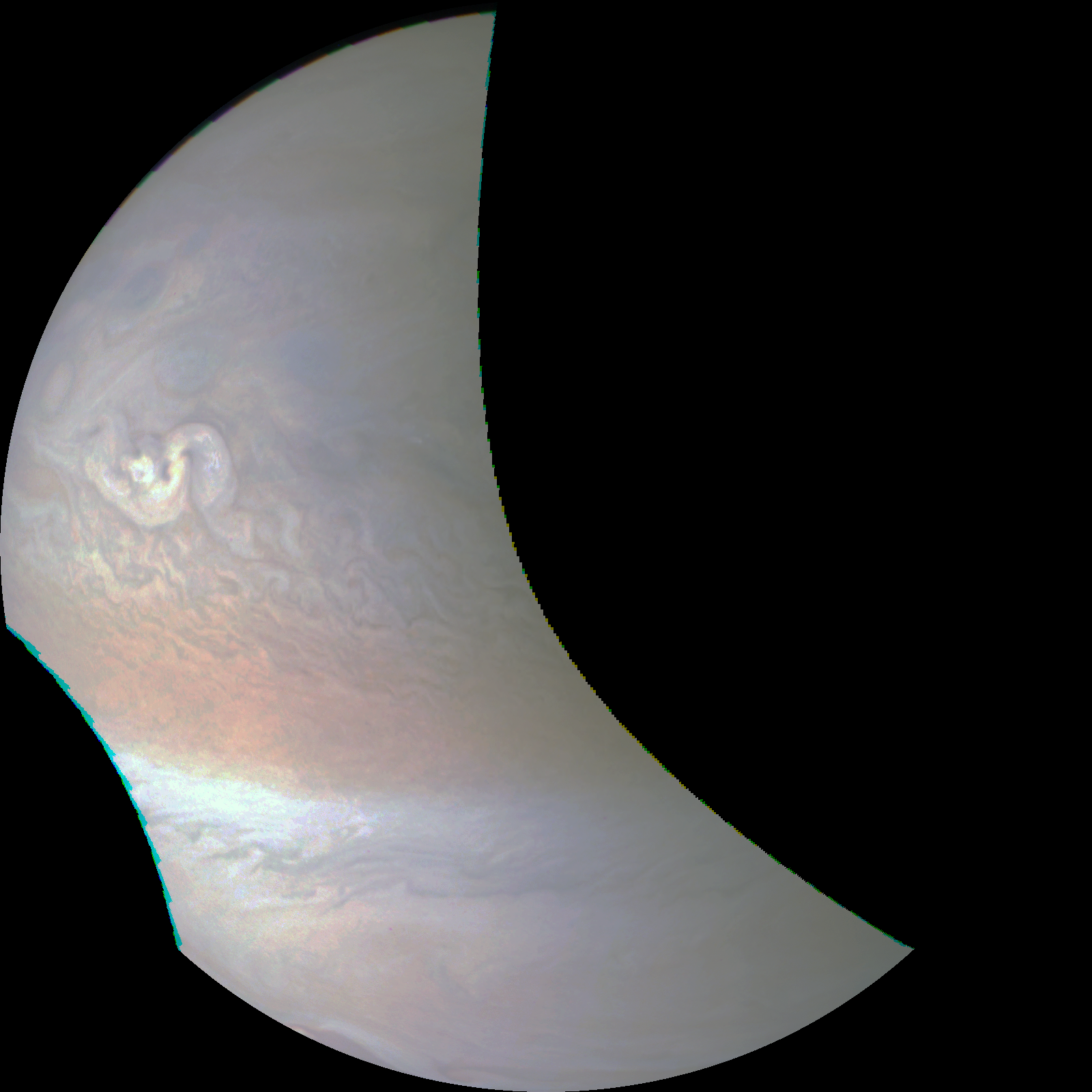 Junocam pixels are 12 bits deep from the camera but are converted to 8 bits inside the instrument using a lossless "companding" table, a process similar to gamma correction, to reduce their size. All Junocam products on the missionjuno website are in this 8-bit form as received on Earth. Scientific users interested in radiometric analysis should use the "RDR" data products archived with the Planetary Data System, which have been converted back to a linear 12-bit scale.