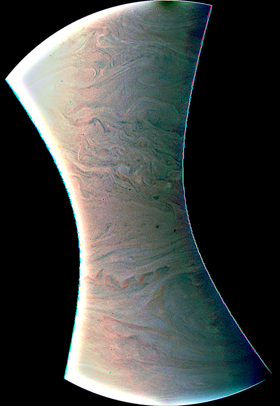 Junocam pixels are 12 bits deep from the camera but are converted to 8 bits inside the instrument using a lossless "companding" table, a process similar to gamma correction, to reduce their size. All Junocam products on the missionjuno website are in this 8-bit form as received on Earth. Scientific users interested in radiometric analysis should use the "RDR" data products archived with the Planetary Data System, which have been converted back to a linear 12-bit scale.