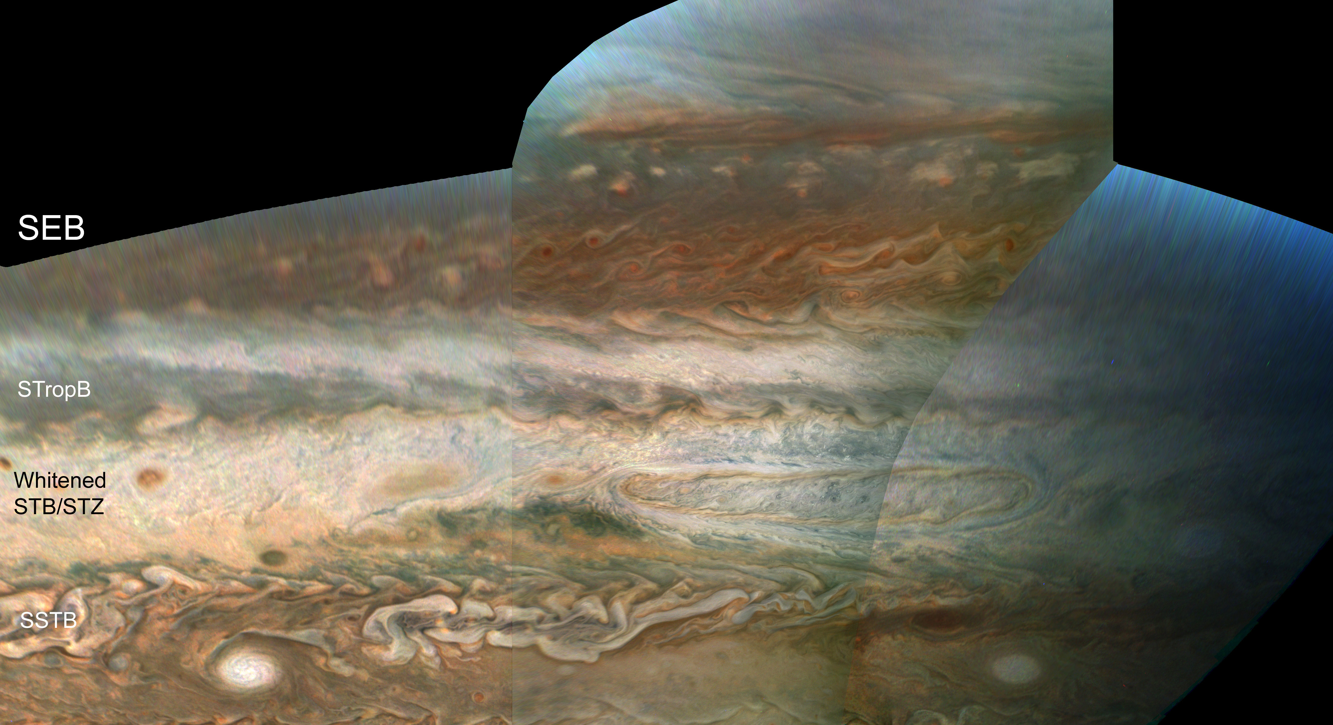 This impressive cyclonic circulation, already viewed closely at PJ8, is shown again at PJ10; here is a cylindrical projection map of the region.