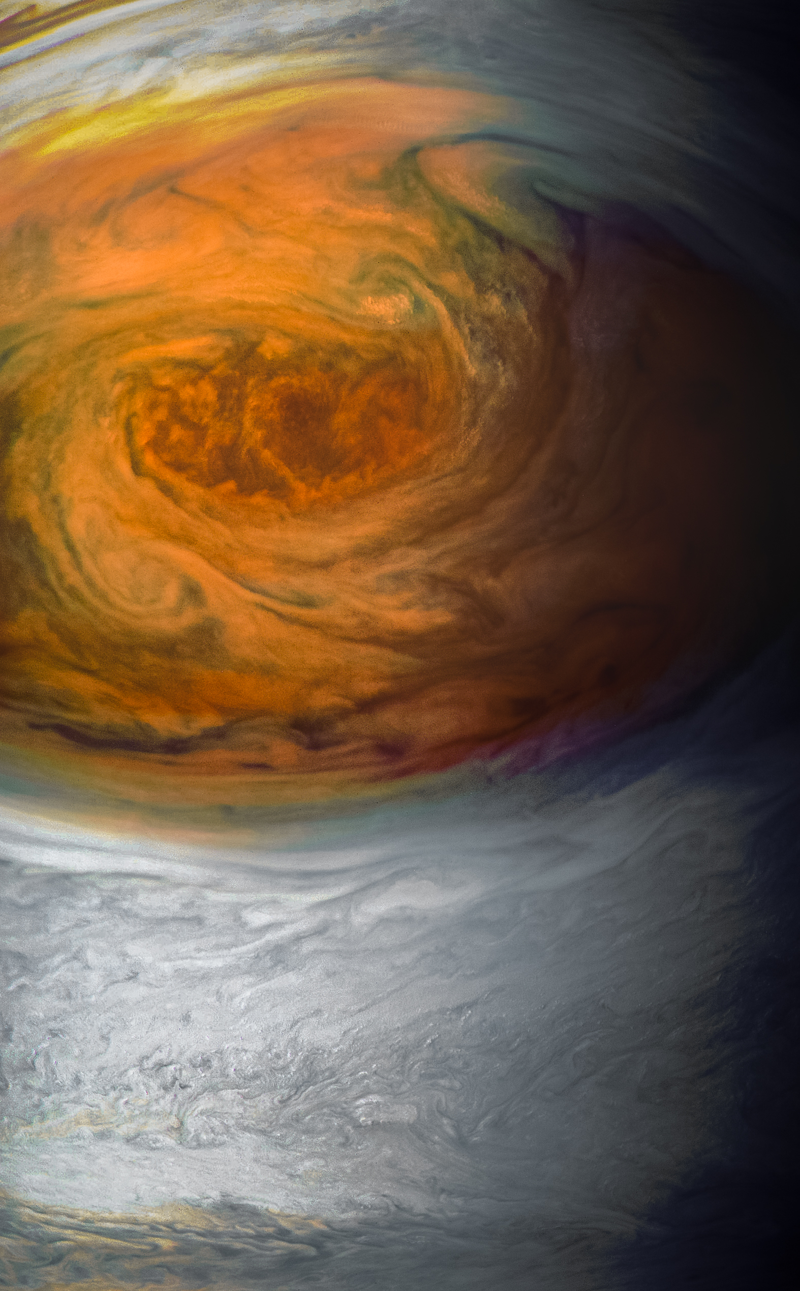 Junocam pixels are 12 bits deep from the camera but are converted to 8 bits inside the instrument using a lossless "companding" table, a process similar to gamma correction, to reduce their size. All Junocam products on the missionjuno website are in this 8-bit form as received on Earth. Scientific users interested in radiometric analysis should use the "RDR" data products archived with the Planetary Data System, which have been converted back to a linear 12-bit scale.