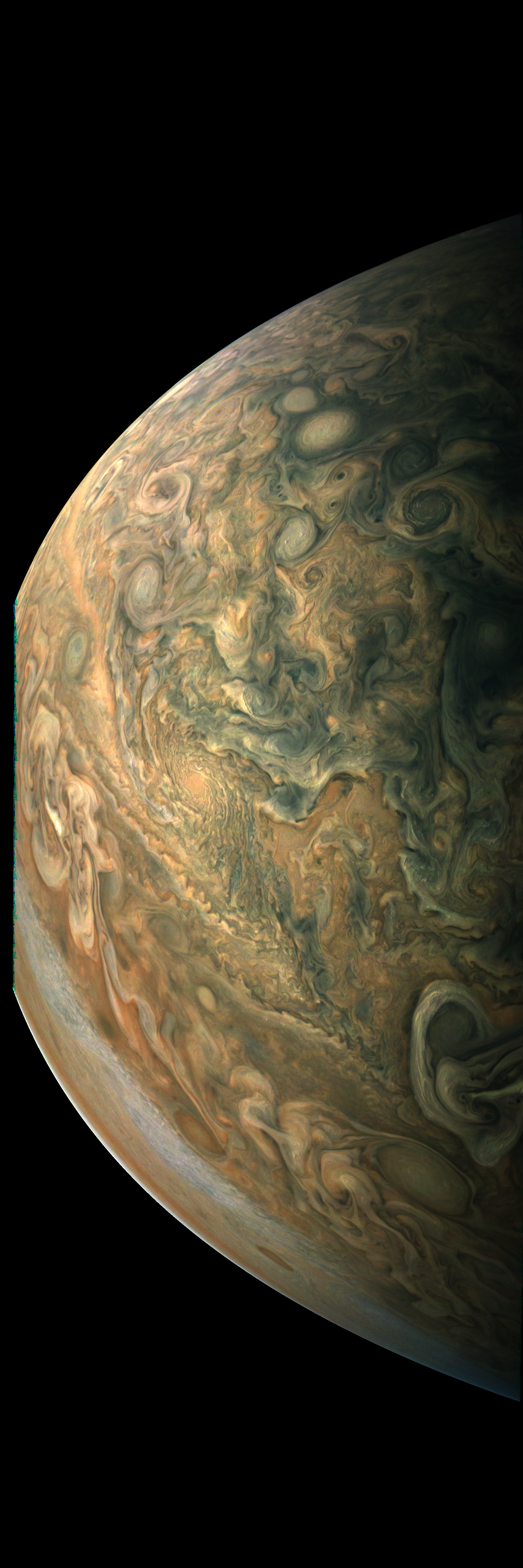 Junocam pixels are 12 bits deep from the camera but are converted to 8 bits inside the instrument using a lossless "companding" table, a process similar to gamma correction, to reduce their size. All Junocam products on the missionjuno website are in this 8-bit form as received on Earth. Scientific users interested in radiometric analysis should use the "RDR" data products archived with the Planetary Data System, which have been converted back to a linear 12-bit scale.