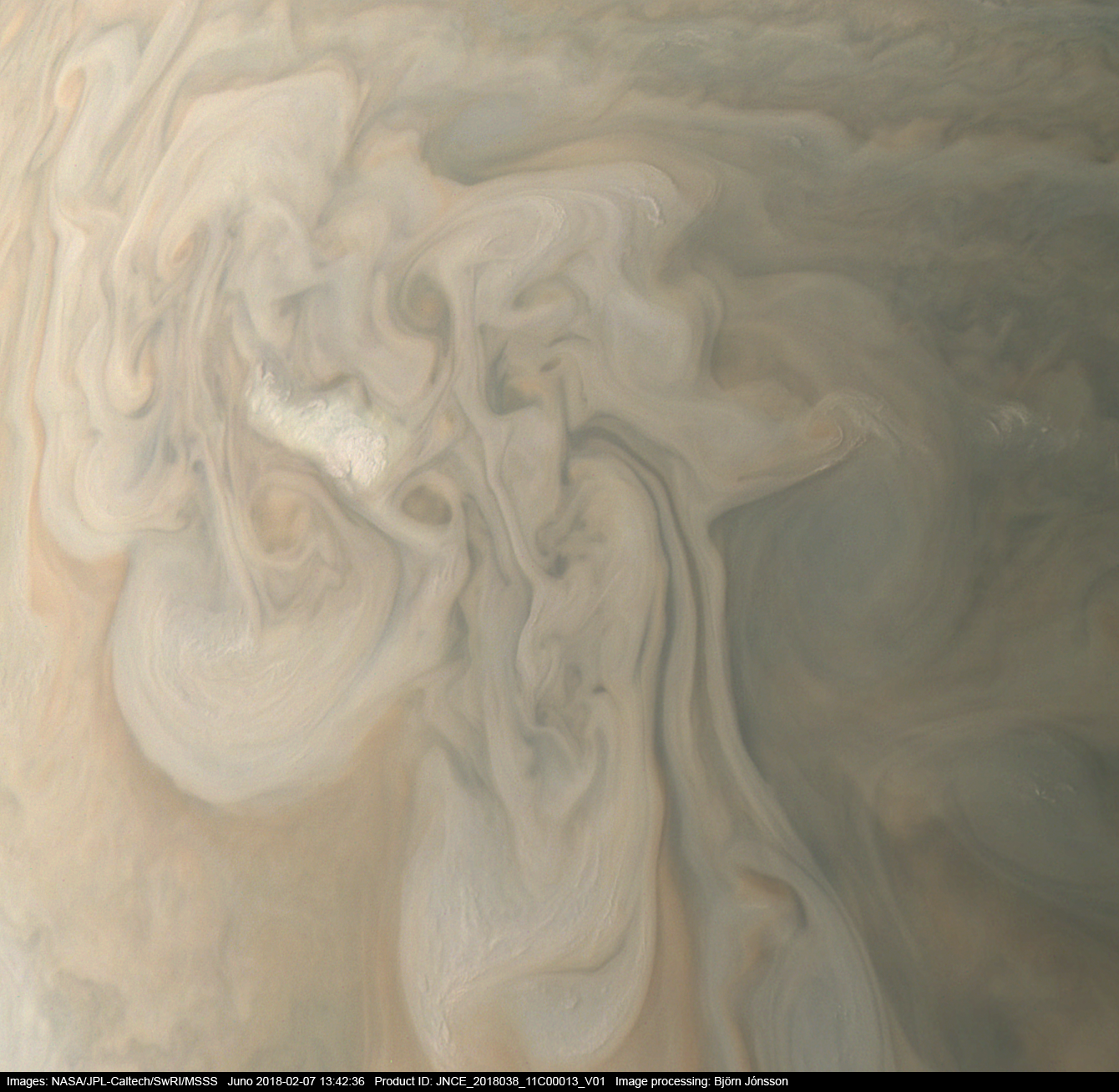 Preliminary processing of image PJ11_13. This is an approximately true color/contrast view. It shows a very bright cloud feature; care was taken not to saturate it during the processing. This image has been cropped and enlarged by a factor of 1.2 relative to the original data.