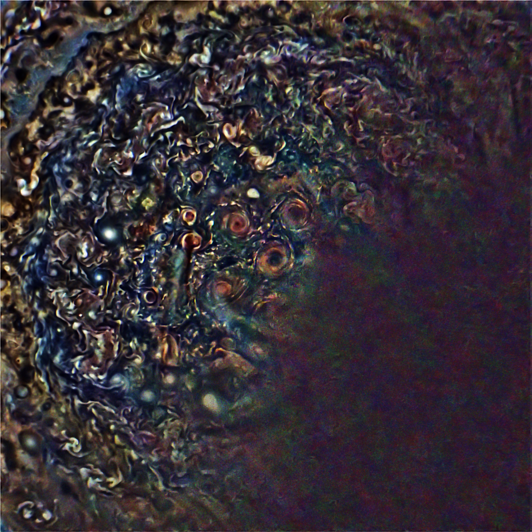 Perijove 11, stack of 12 hipassed south polar maps averaged, "pretty" version