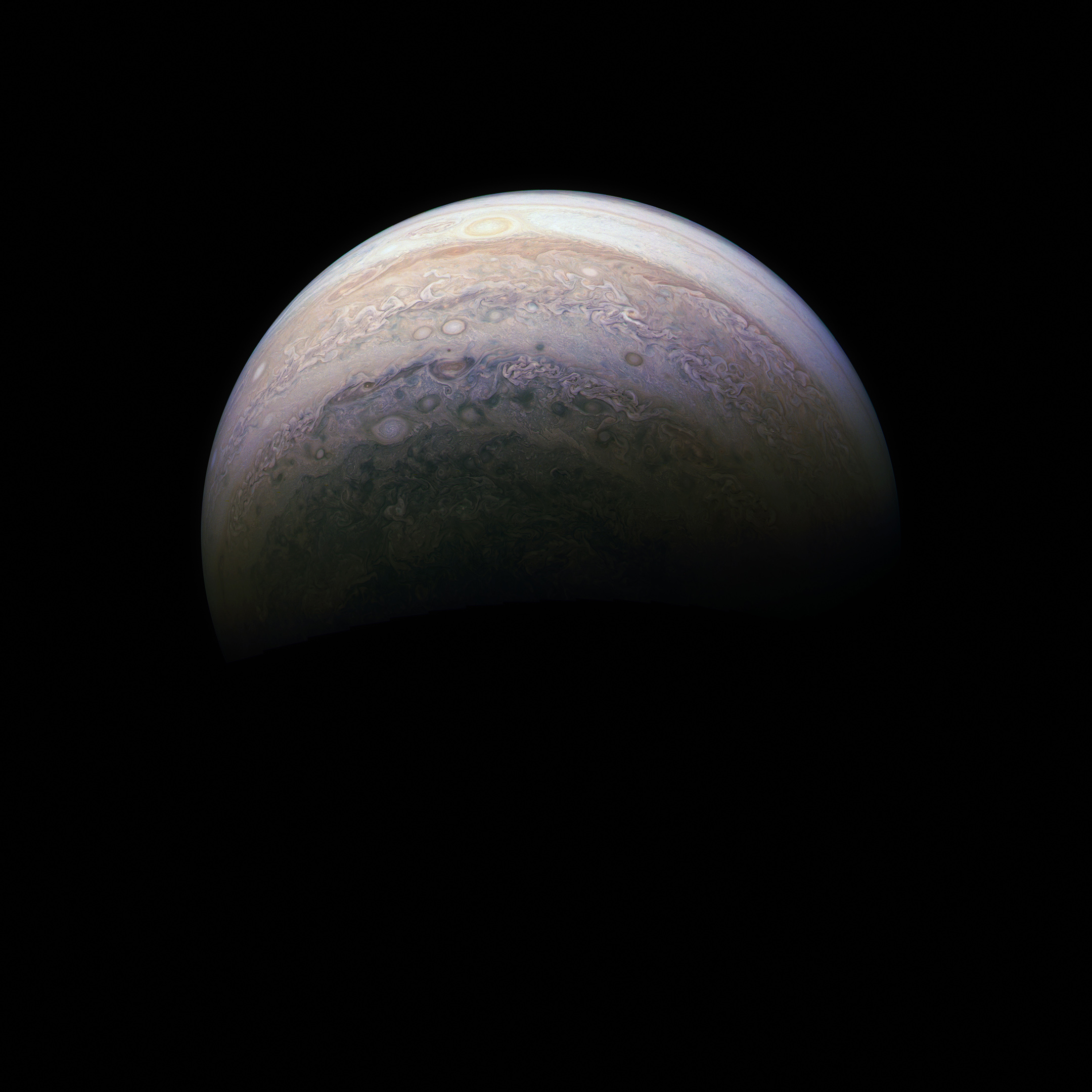 Junocam pixels are 12 bits deep from the camera but are converted to 8 bits inside the instrument using a lossless "companding" table, a process similar to gamma correction, to reduce their size. All Junocam products on the missionjuno website are in this 8-bit form as received on Earth. Scientific users interested in radiometric analysis should use the "RDR" data products archived with the Planetary Data System, which have been converted back to a linear 12-bit scale.