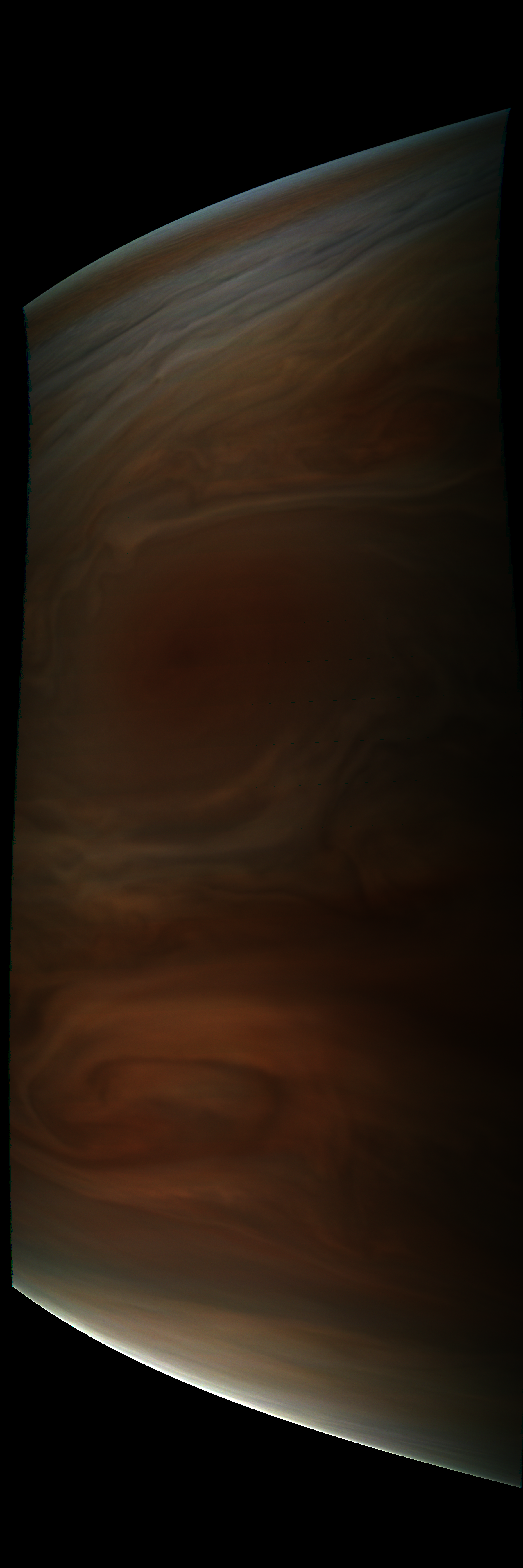 The raw has been decompanded, approximately radiometrically corrected, reprojected to a cylindrical FOV of 60x180 degrees using SPICE kernels and a Jupiter spheroid model, illumination-adjusted by a slightly modified best-fit illumination model derived from PJ6 images, gamma-stretched with gamma=4 relative to radiometric data, and mostly patched from repetitive camera artifacts.