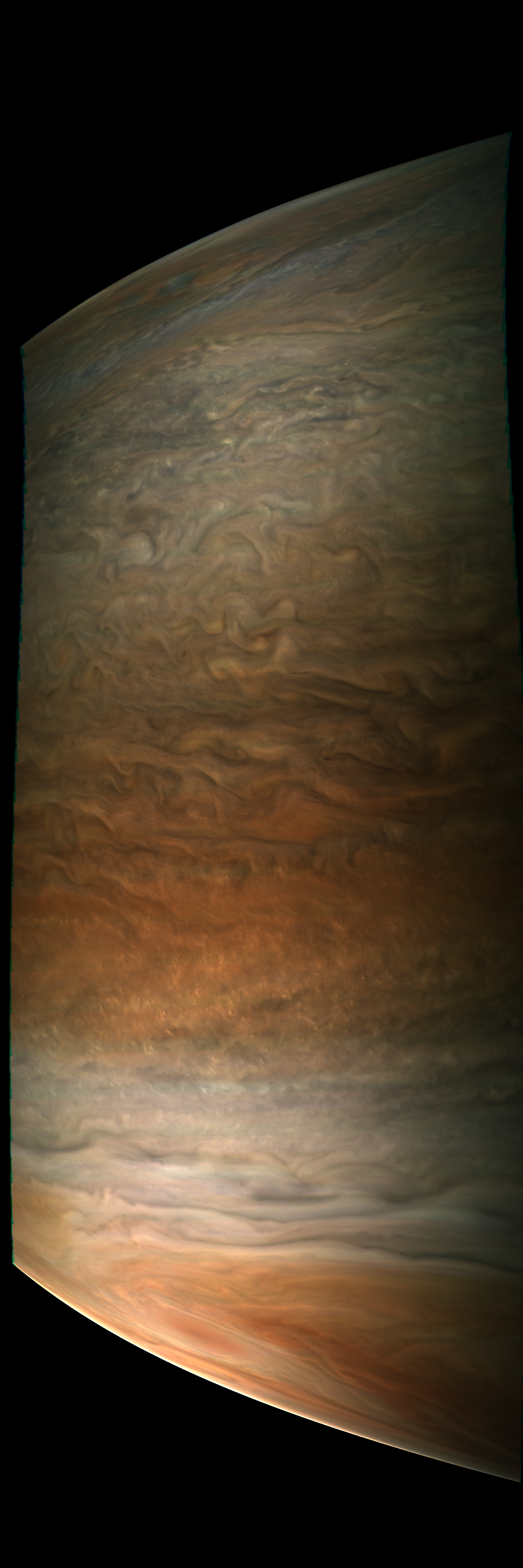 The raw has been decompanded, approximately radiometrically corrected, reprojected to a cylindrical FOV of 60x180 degrees using SPICE kernels and a Jupiter spheroid model, illumination-adjusted by a slightly modified best-fit illumination model derived from PJ6 images, gamma-stretched with gamma=4 relative to radiometric data, and mostly patched from repetitive camera artifacts.