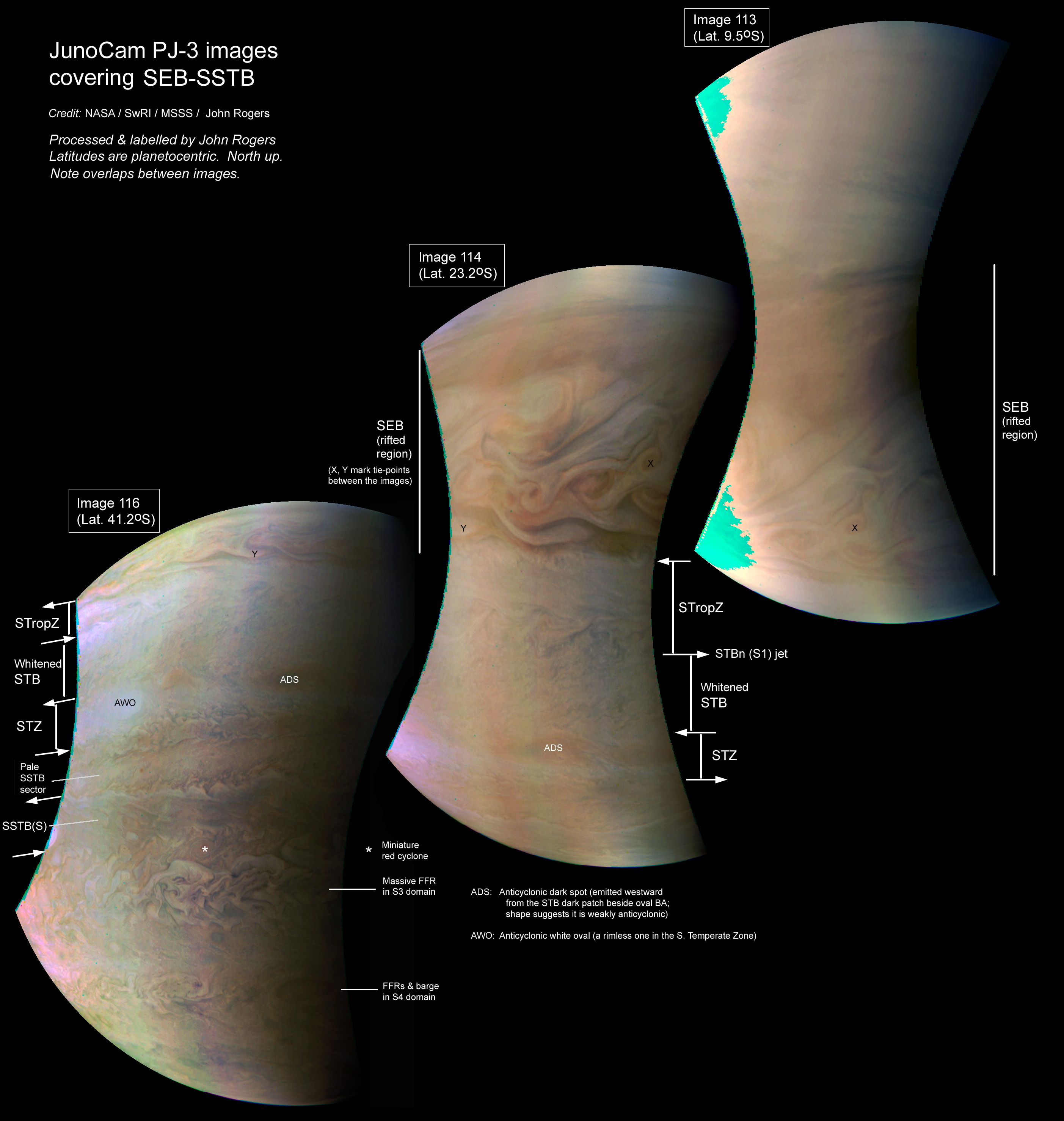 These close-up images show the SEB (sector west of the GRS with its ongoing large-scale convective ‘rifts’); S. Tropical Zone and whitened STB (essentially white but with contrasting cloud textures); STZ (with contrasting anticyclonic spots); and SSTB (the pale sector between ovals A3 and A4; it clearly appears as a cyclonic circulation, though it is now more orange than white). --John Rogers.