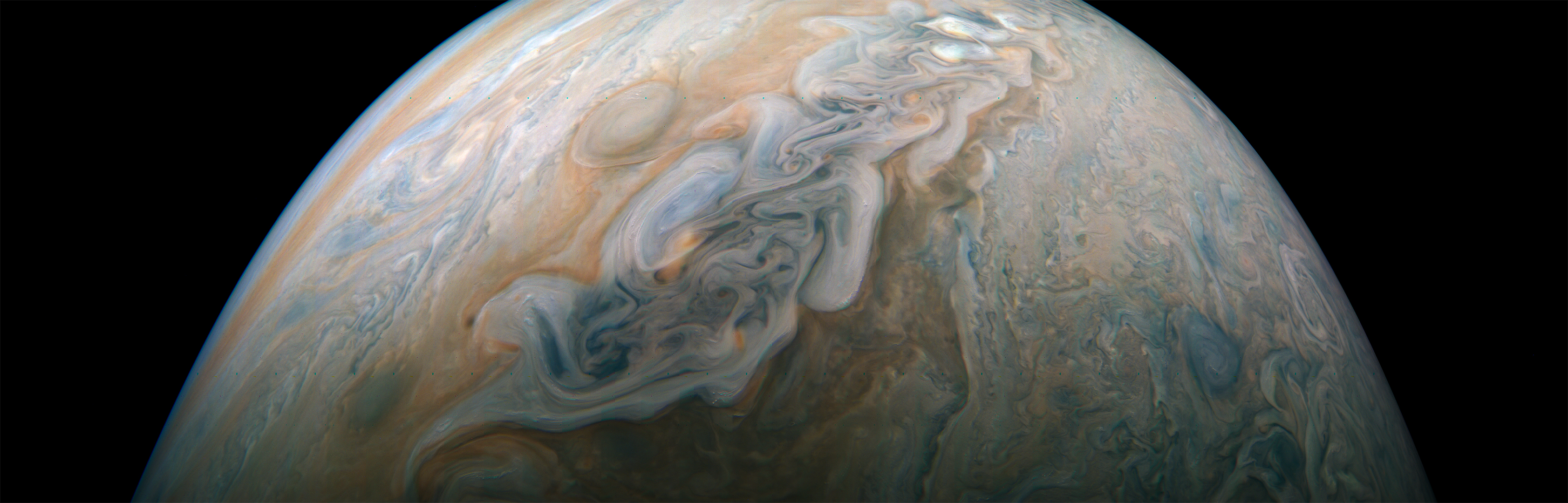 Junocam pixels are 12 bits deep from the camera but are converted to 8 bits inside the instrument using a lossless "companding" table, a process similar to gamma correction, to reduce their size. All Junocam products on the missionjuno website are in this 8-bit form as received on Earth. Scientific users interested in radiometric analysis should use the "RDR" data products archived with the Planetary Data System, which have been converted back to a linear 12-bit scale.