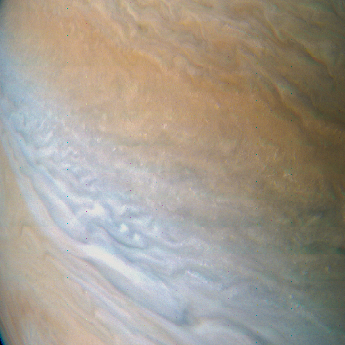 Junocam pixels are 12 bits deep from the camera but are converted to 8 bits inside the instrument using a lossless "companding" table, a process similar to gamma correction, to reduce their size. All Junocam products on the missionjuno website are in this 8-bit form as received on Earth. Scientific users interested in radiometric analysis should use the "RDR" data products archived with the Planetary Data System, which have been converted back to a linear 12-bit scale.