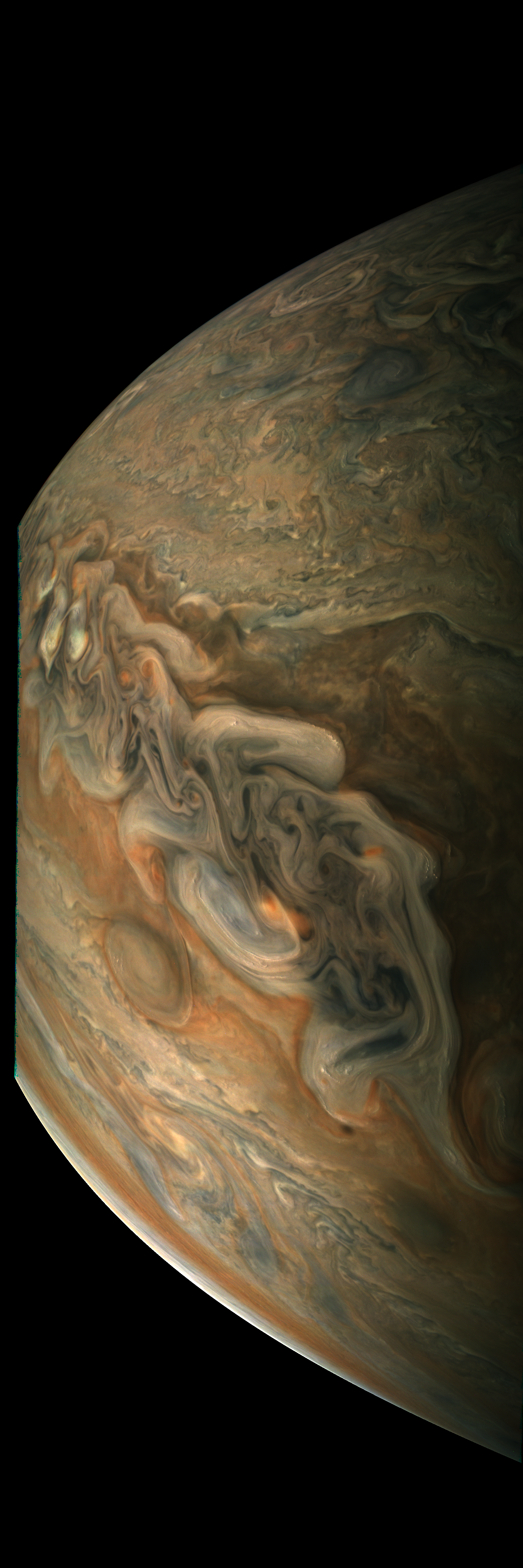 Junocam pixels are 12 bits deep from the camera but are converted to 8 bits inside the instrument using a lossless "companding" table, a process similar to gamma correction, to reduce their size. All Junocam products on the missionjuno website are in this 8-bit form as received on Earth. Scientific users interested in radiometric analysis should use the "RDR" data products archived with the Planetary Data System, which have been converted back to a linear 12-bit scale.