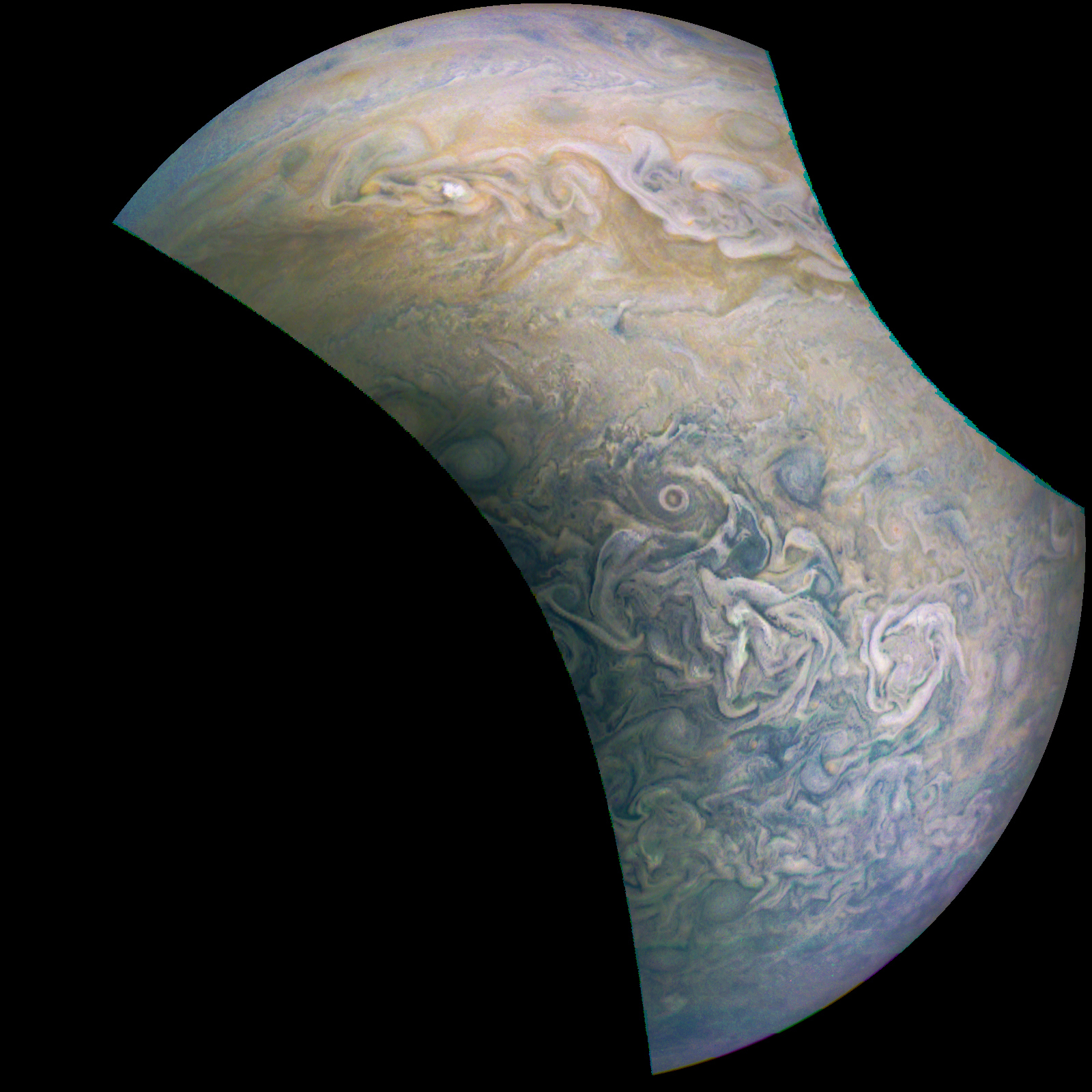 Junocam pixels are 12 bits deep from the camera but are converted to 8 bits inside the instrument using a lossless "companding" table, a process similar to gamma correction, to reduce their size. All Junocam products on the missionjuno website are in this 8-bit form as received on Earth. Scientific users interested in radiometric analysis should use the "RDR" data products archived with the Planetary Data System, which have been converted back to a linear 12-bit scale.