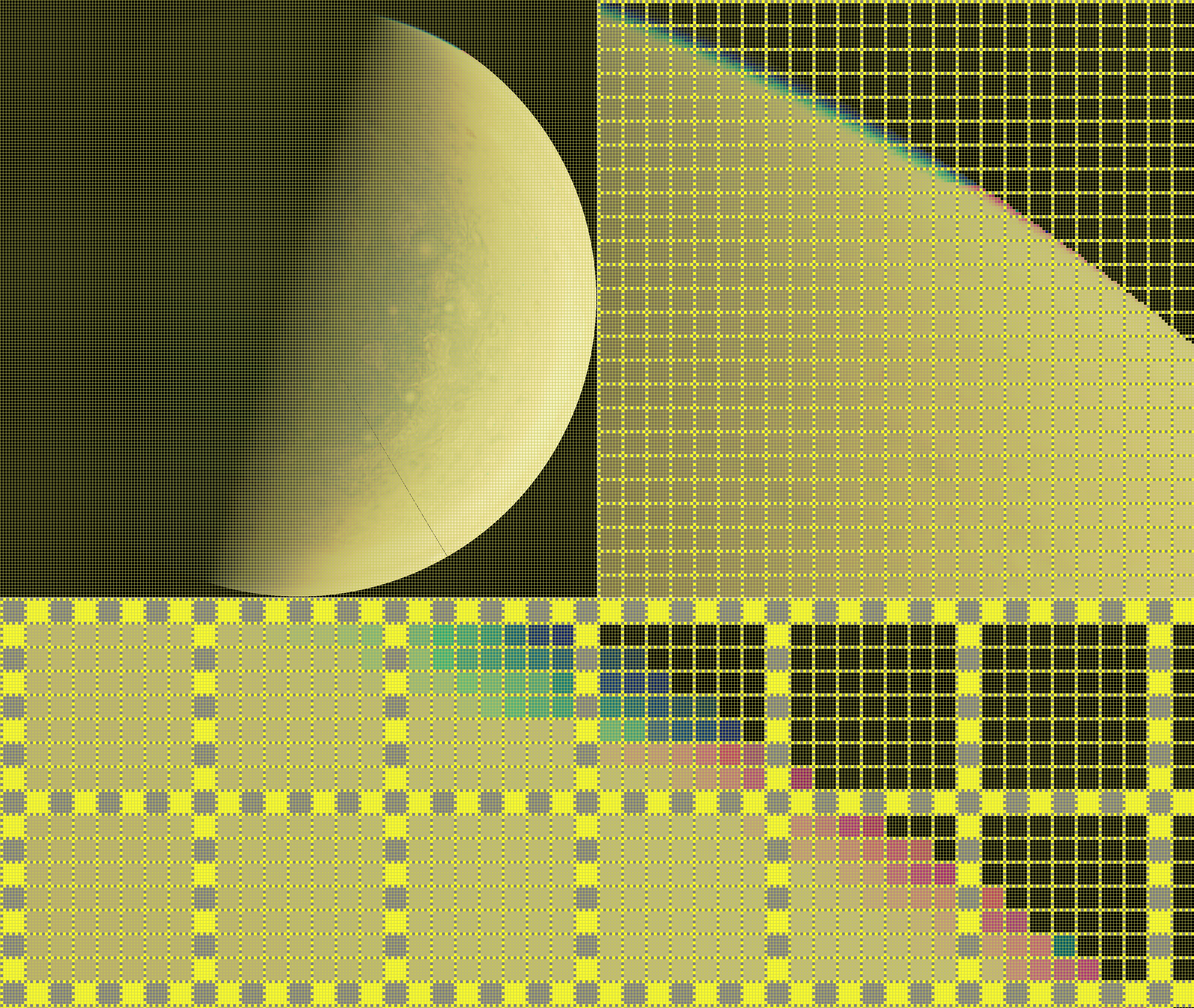 Digital Art Color Experiment. 'South pole at minimum emission angle' processed on Windows and Windows Paint. Processes: Windows Paint Grid at zoom x8 was 'Print Screened' and applied at the front of the image. Than a random area from the image is zoomed at x8; a command Grid is applied; command 'Print Screen' and than the image area is Cropped. Than a random area from the zoom x8 Cropped image is zoomed at x8; a command Grid is applied again; command 'Print Screen' and than the image area is Cropped. Inverted Colors. Monochrome. Colored [the colors from the Juno on-line Game were used]; Inverted Colors.