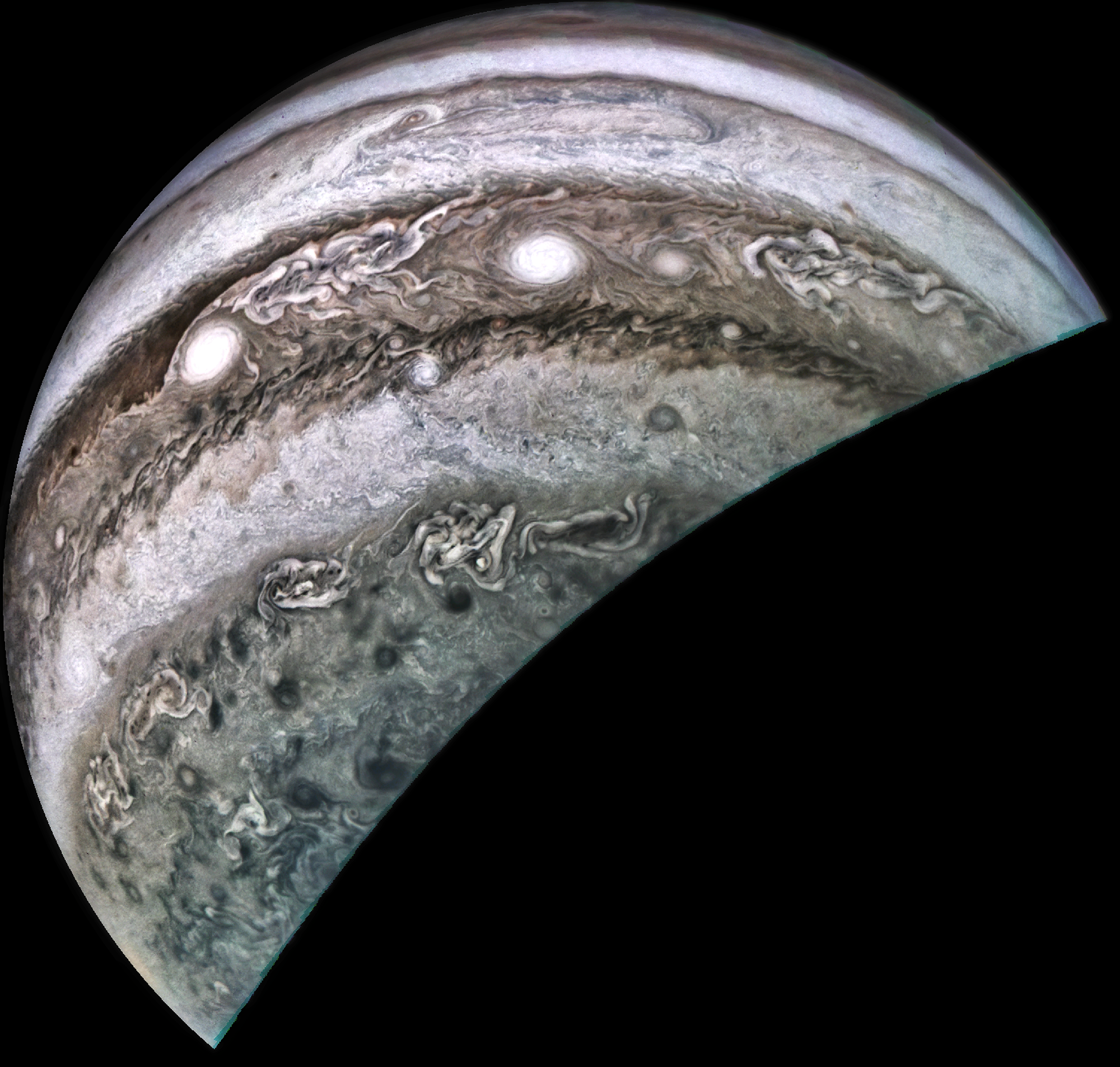 Junocam pixels are 12 bits deep from the camera but are converted to 8 bits inside the instrument using a lossless "companding" table, a process similar to gamma correction, to reduce their size. All Junocam products on the missionjuno website are in this 8-bit form as received on Earth. Scientific users interested in radiometric analysis should use the "RDR" data products archived with the Planetary Data System, which have been converted back to a linear 12-bit scale.