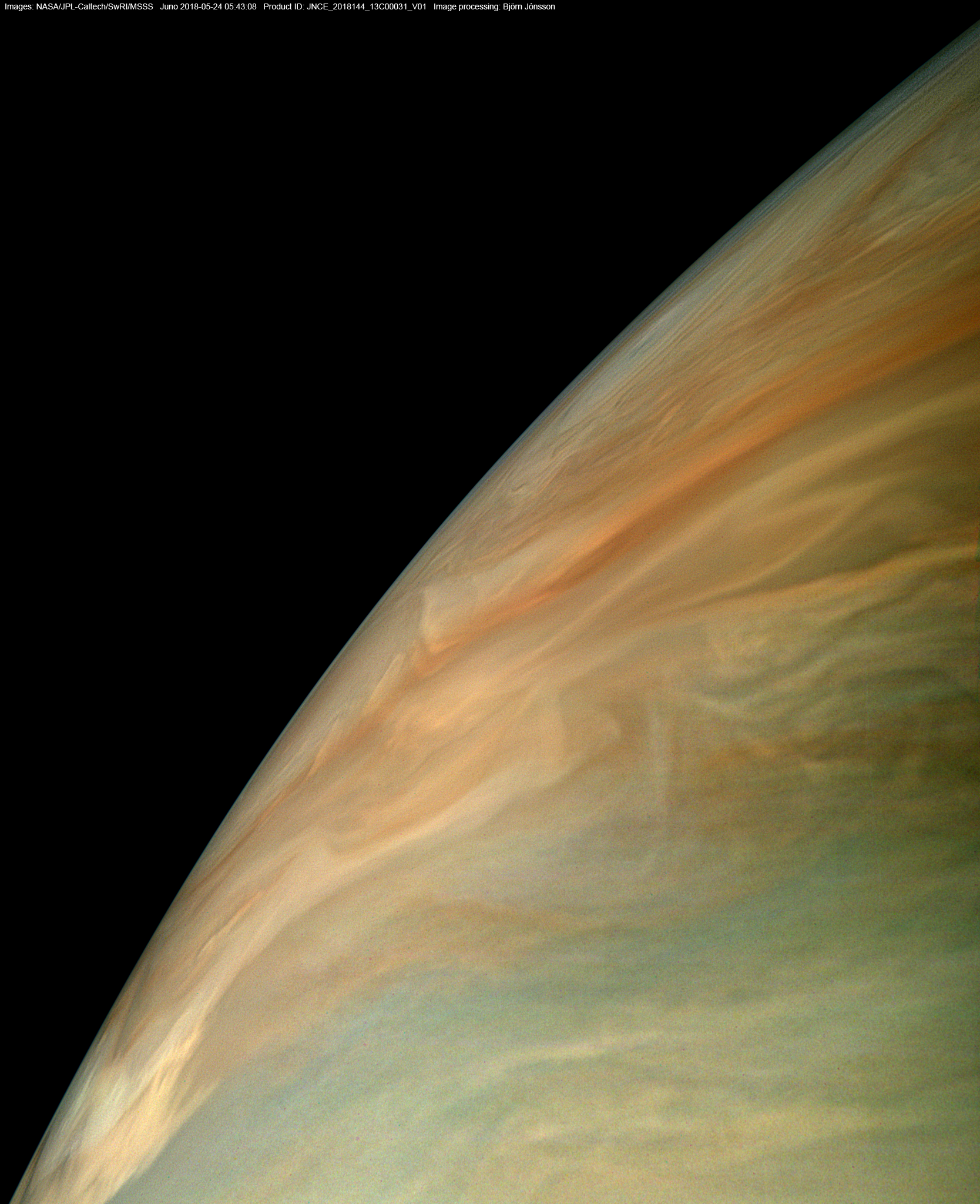 An image processed from the raw image PJ13_31 framelets. The color and contrast is exaggerated in this image and various details have been sharpened.