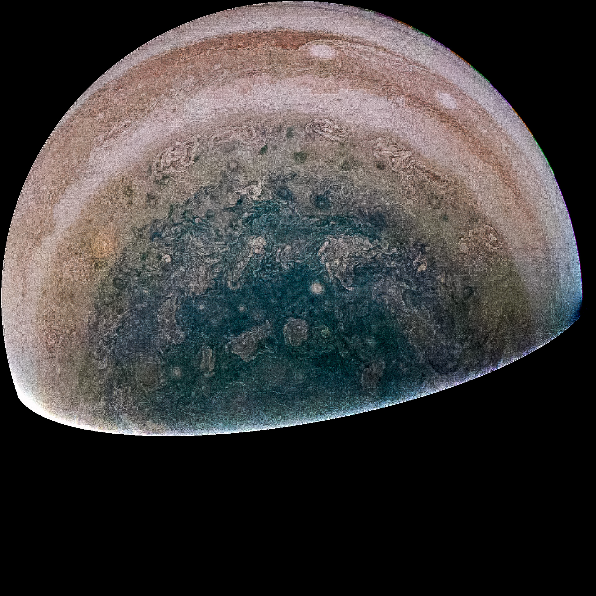 Junocam pixels are 12 bits deep from the camera but are converted to 8 bits inside the instrument using a lossless "companding" table, a process similar to gamma correction, to reduce their size. All Junocam products on the missionjuno website are in this 8-bit form as received on Earth. Scientific users interested in radiometric analysis should use the "RDR" data products archived with the Planetary Data System, which have been converted back to a linear 12-bit scale.