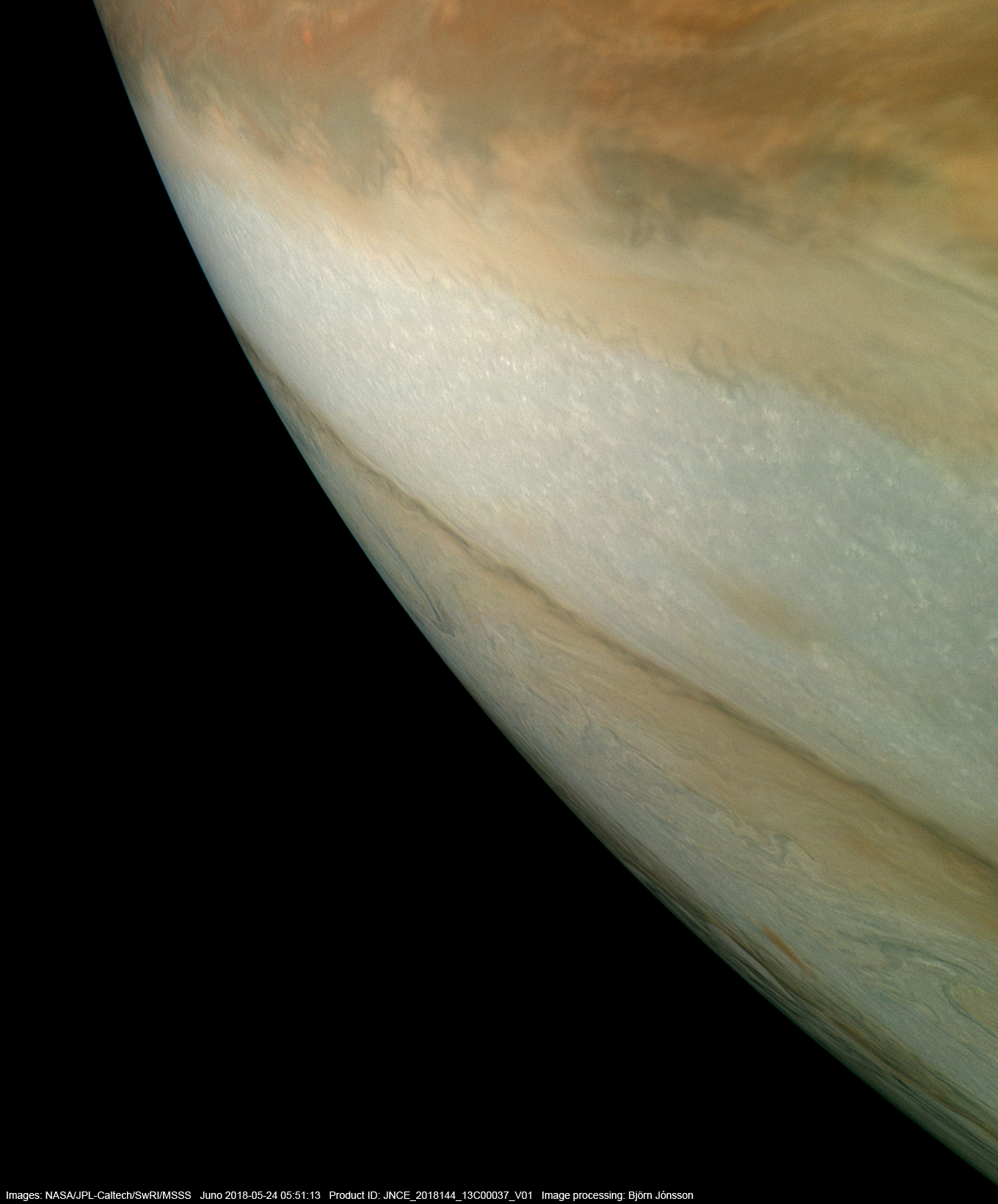 An image processed from the raw image PJ13_37 framelets. The color and contrast is exaggerated in this image and small scale details have been sharpened.