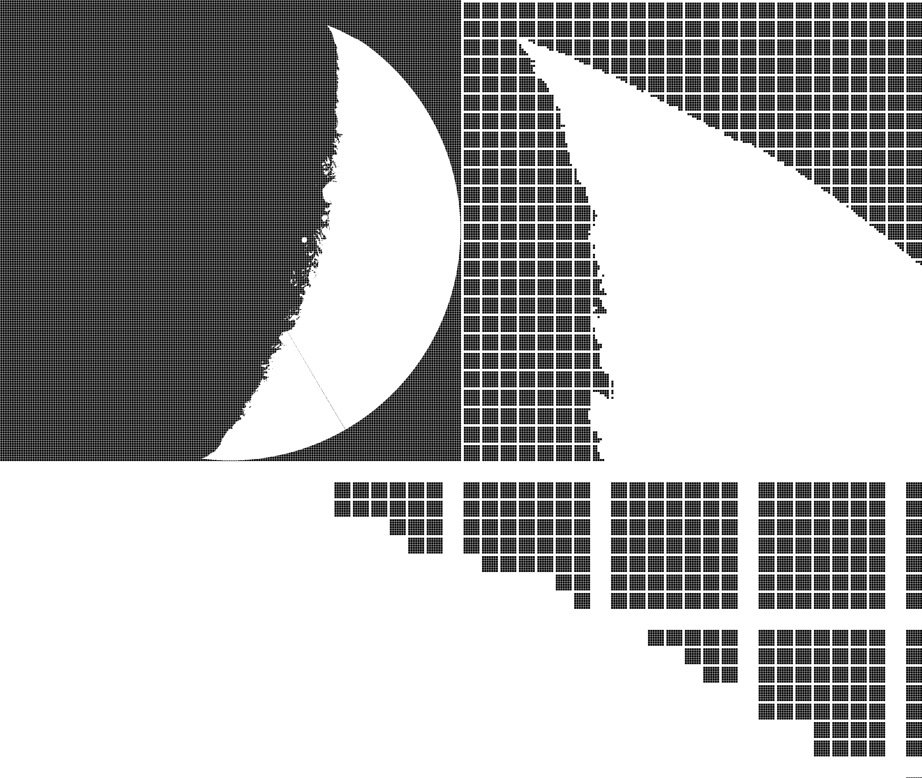 Digital Art Color Experiment. 'South pole at minimum emission angle' processed on Windows and Windows Paint. Processes: Windows Paint Grid at zoom x8 was 'Print Screened' and applied at the front of the image. Than a random area from the image is zoomed at x8; a command Grid is applied; command 'Print Screen' and than the image area is Cropped. Than a random area from the zoom x8 Cropped image is zoomed at x8; a command Grid is applied again; command 'Print Screen' and than the image area is Cropped. Inverted Colors. Monochrome. Colored [the colors from the Juno on-line Game were used]; Inverted Colors.