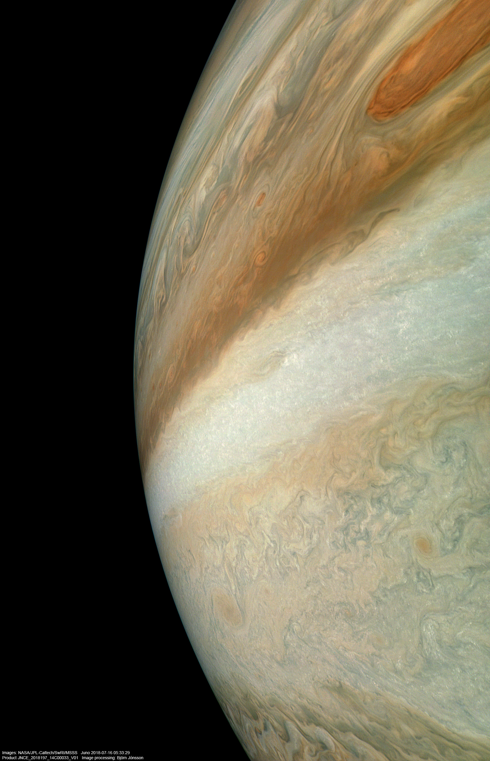 An image processed from the raw image PJ14_33 framelets. The color and contrast is exaggerated in this image and small scale features have been sharpened.