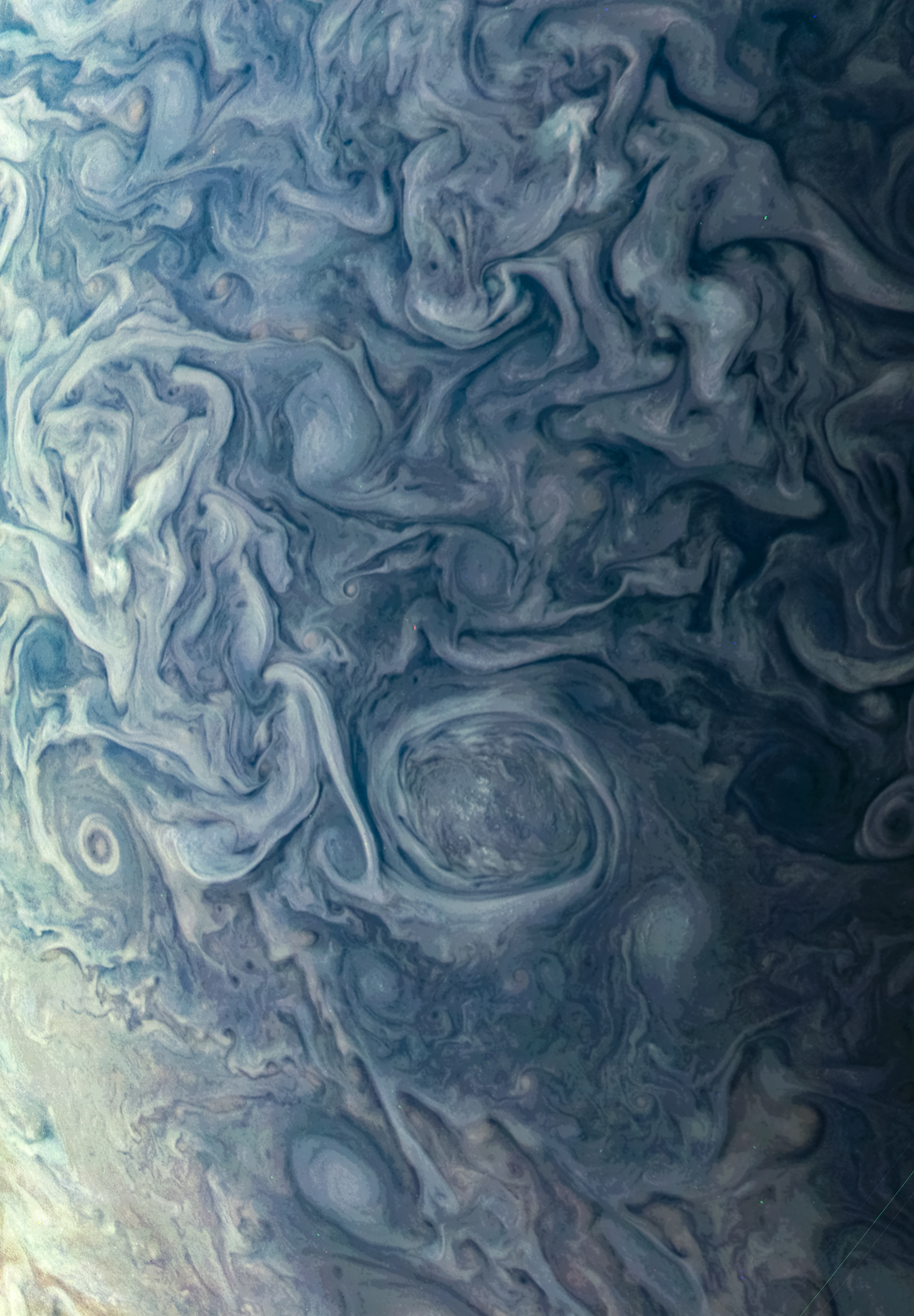 Junocam pixels are 12 bits deep from the camera but are converted to 8 bits inside the instrument using a lossless "companding" table, a process similar to gamma correction, to reduce their size. All Junocam products on the missionjuno website are in this 8-bit form as received on Earth. Scientific users interested in radiometric analysis should use the "RDR" data products archived with the Planetary Data System, which have been converted back to a linear 12-bit scale.