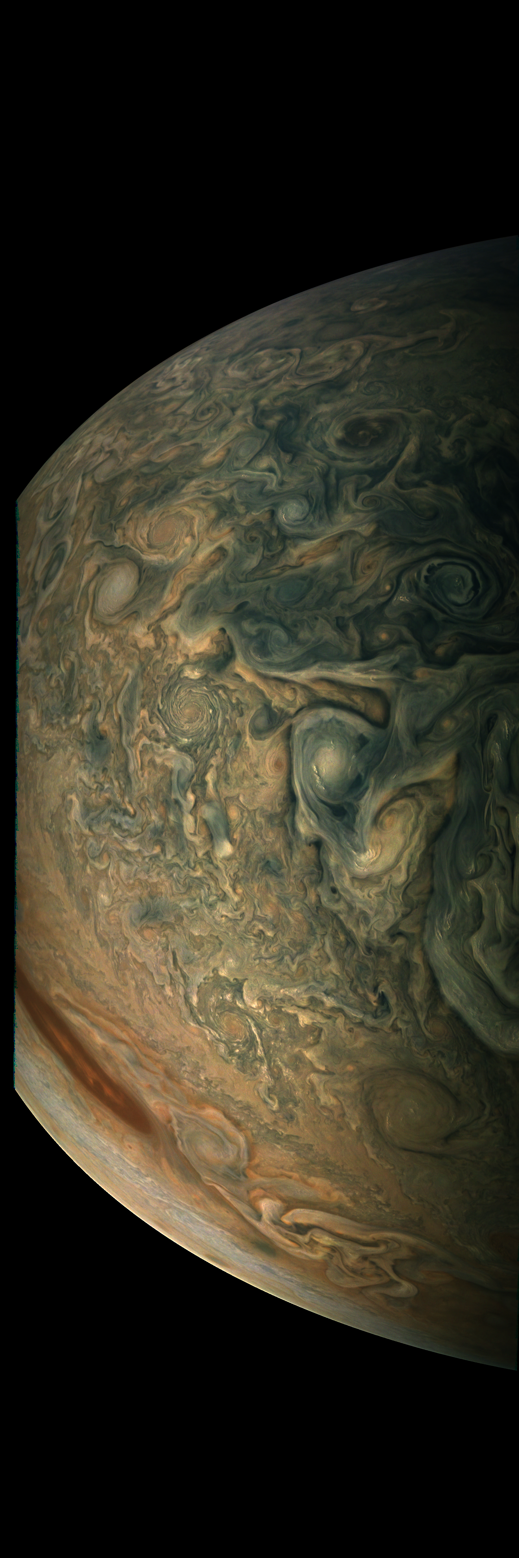 Junocam pixels are 12 bits deep from the camera but are converted to 8 bits inside the instrument using a lossless "companding" table, a process similar to gamma correction, to reduce their size. All Junocam products on the missionjuno website are in this 8-bit form as received on Earth. Scientific users interested in radiometric analysis should use the "RDR" data products archived with the Planetary Data System, which have been converted back to a linear 12-bit scale.