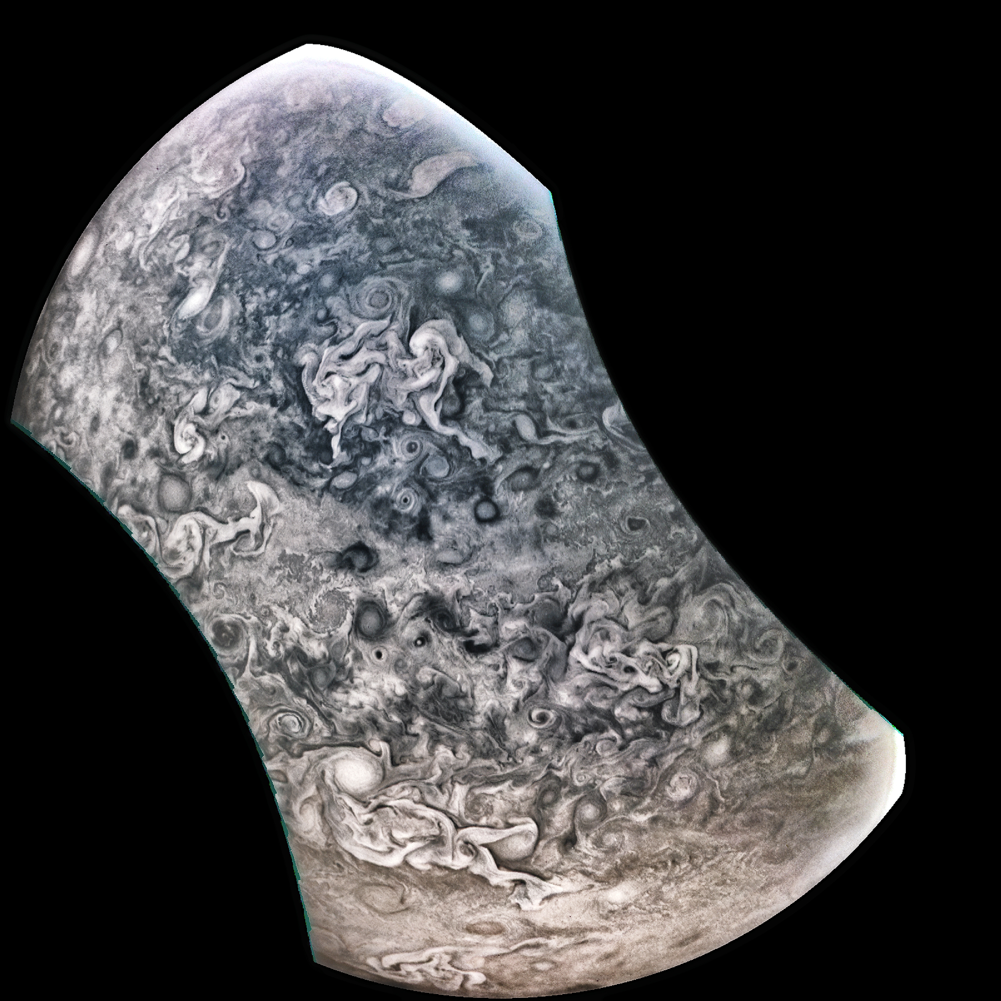 Junocam pixels are 12 bits deep from the camera but are converted to 8 bits inside the instrument using a lossless "companding" table, a process similar to gamma correction, to reduce their size. All Junocam products on the missionjuno website are in this 8-bit form as received on Earth. Scientific users interested in radiometric analysis should use the "RDR" data products archived with the Planetary Data System, which have been converted back to a linear 12-bit scale.