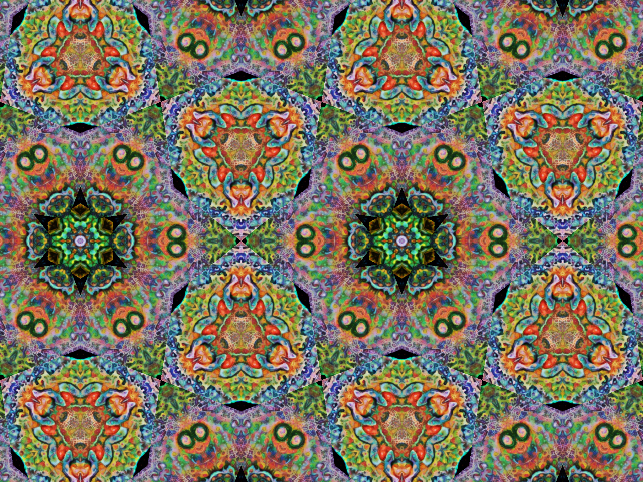 Detail of colour enhanced with multiple overlaid "AI mediated" abstract filters with kaleidoscopic projection
