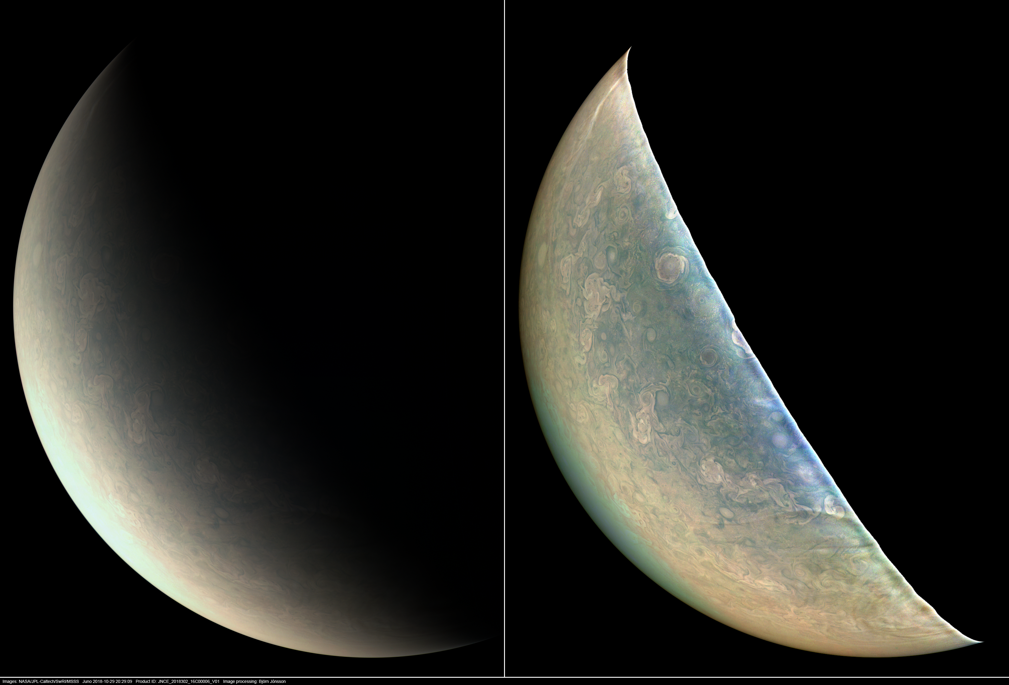 Images processed from the PJ16_6 raw image framelets. The left version is an approximately true color/contrast image. In the right image the effects of the variable illumination have been removed and the contrast has been increased. This reveals various details in the dimly illuminated areas around Jupiter's north pole. Areas near the limb at lower left are overexposed because the exposure time was increased to better show the dimly lit areas near the north pole.
