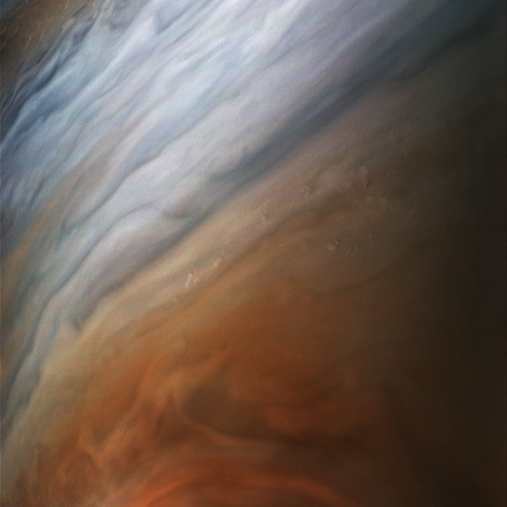 Junocam pixels are 12 bits deep from the camera but are converted to 8 bits inside the instrument using a lossless "companding" table, a process similar to gamma correction, to reduce their size. All Junocam products on the missionjuno website are in this 8-bit form as received on Earth. Scientific users interested in radiometric analysis should use the "RDR" data products archived with the Planetary Data System, which have been converted back to a linear 12-bit scale.